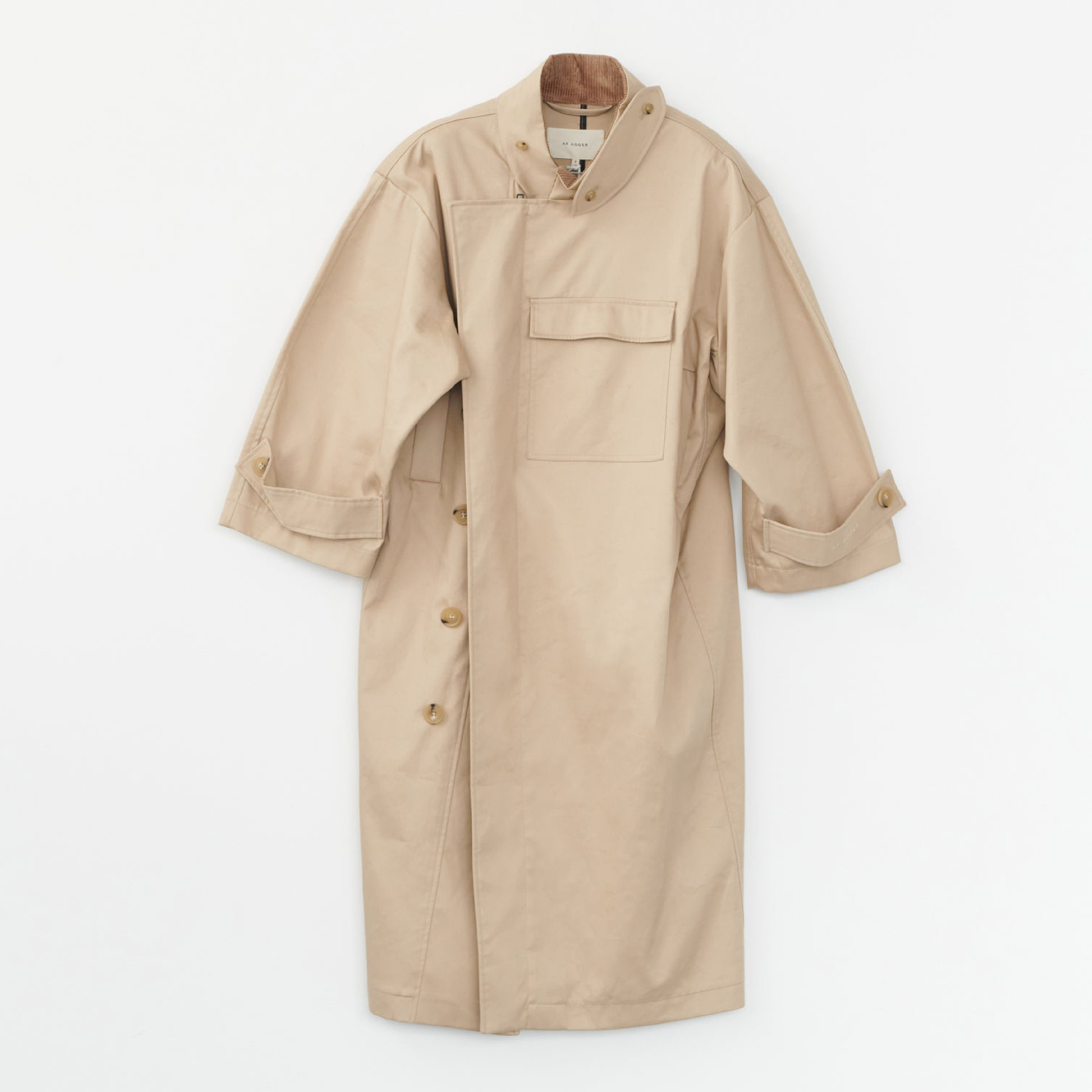 Water Resistant Coat farven ‘Cool Beige’ fra AF Agger. Den populære frakke i beige med en oversize pasform. Frakken lukkes med en skjult lynlås fortil og knapper. Kraven har fløjl på indersiden, en brystlomme og to sidelommer.