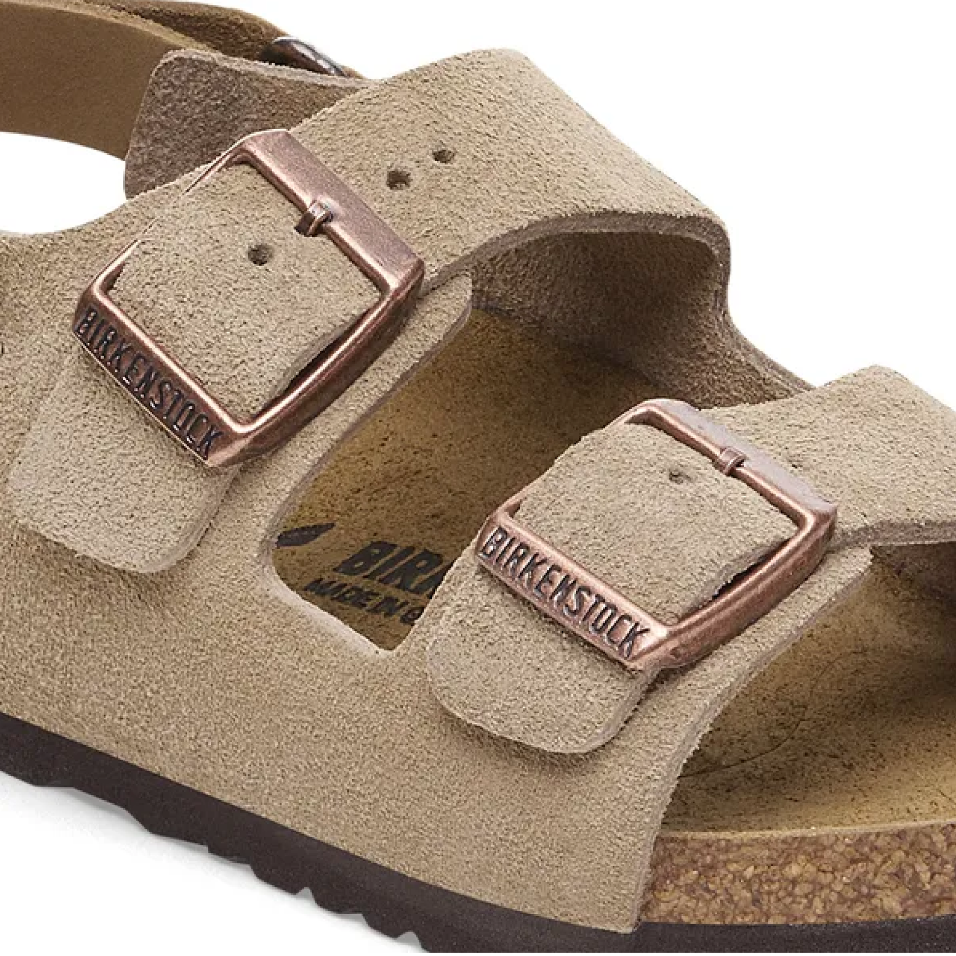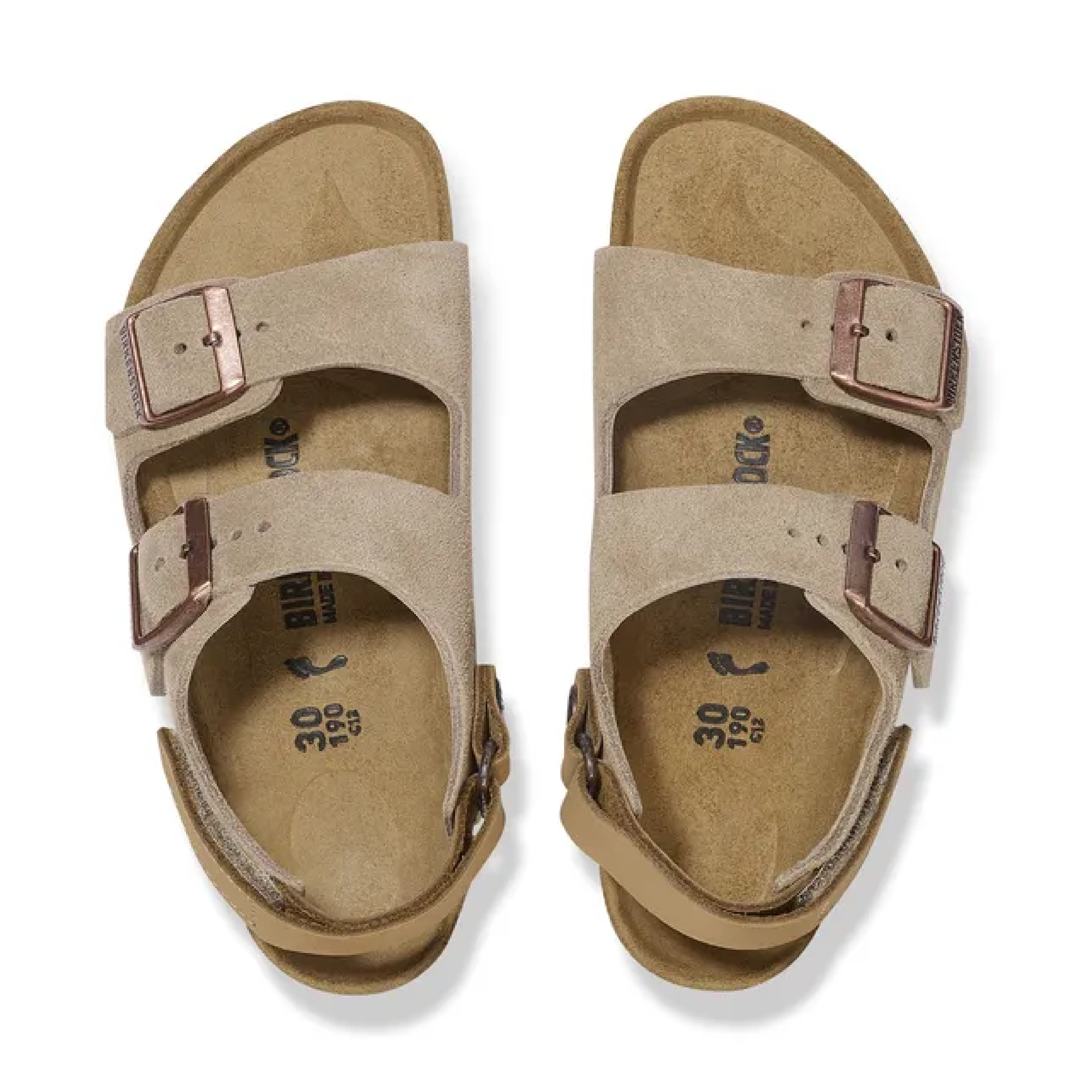 De klassiske Milano sandaler til børn fra Birkenstock. En rigtig klassiker, der sidder godt på foden - og giver barnet en god støtte. Milano-sandalen har to justerbare stropper foran, samt lukkes med velcro bagpå, med en blød fodseng - som tilpasser sig fodens kontur og giver en god affjedring.