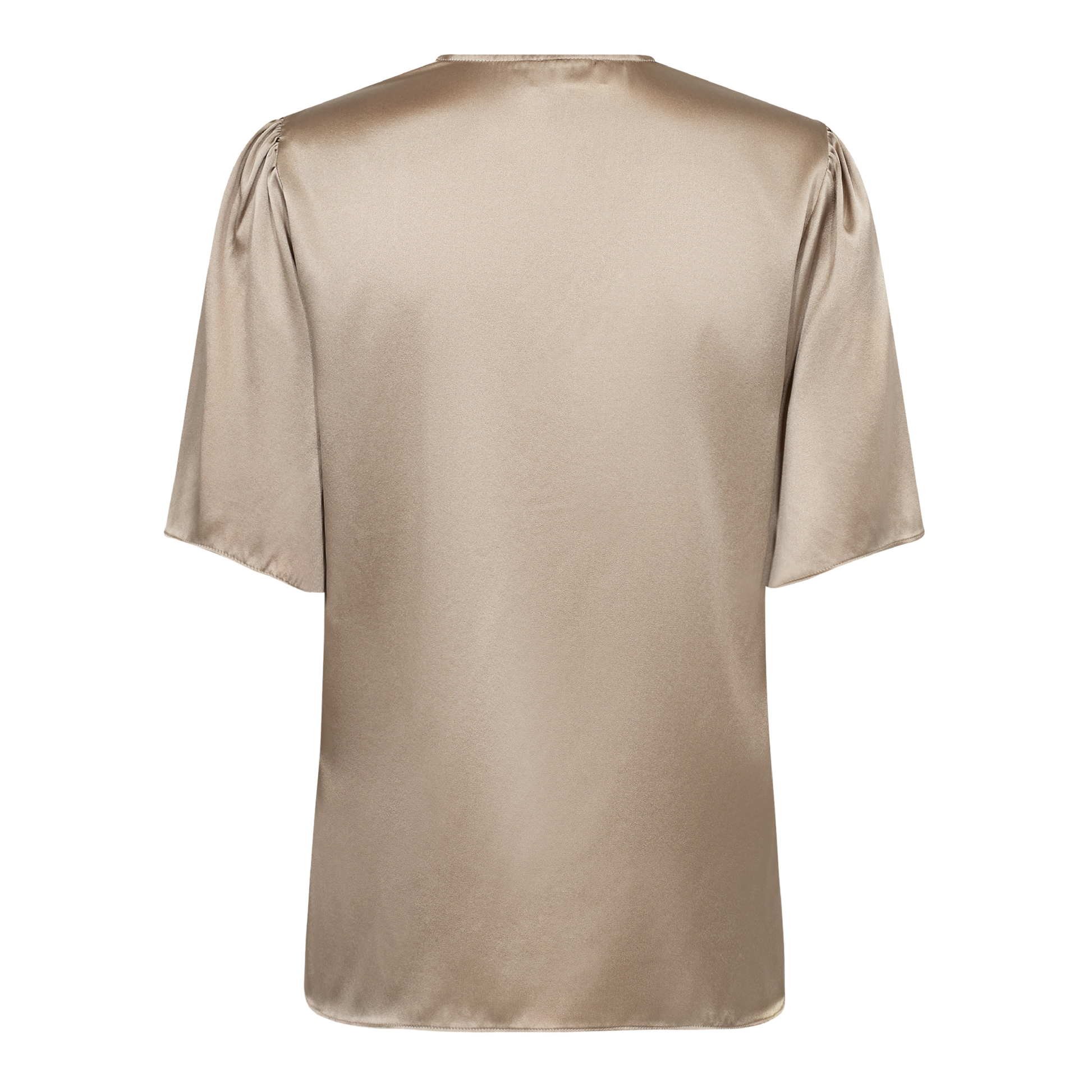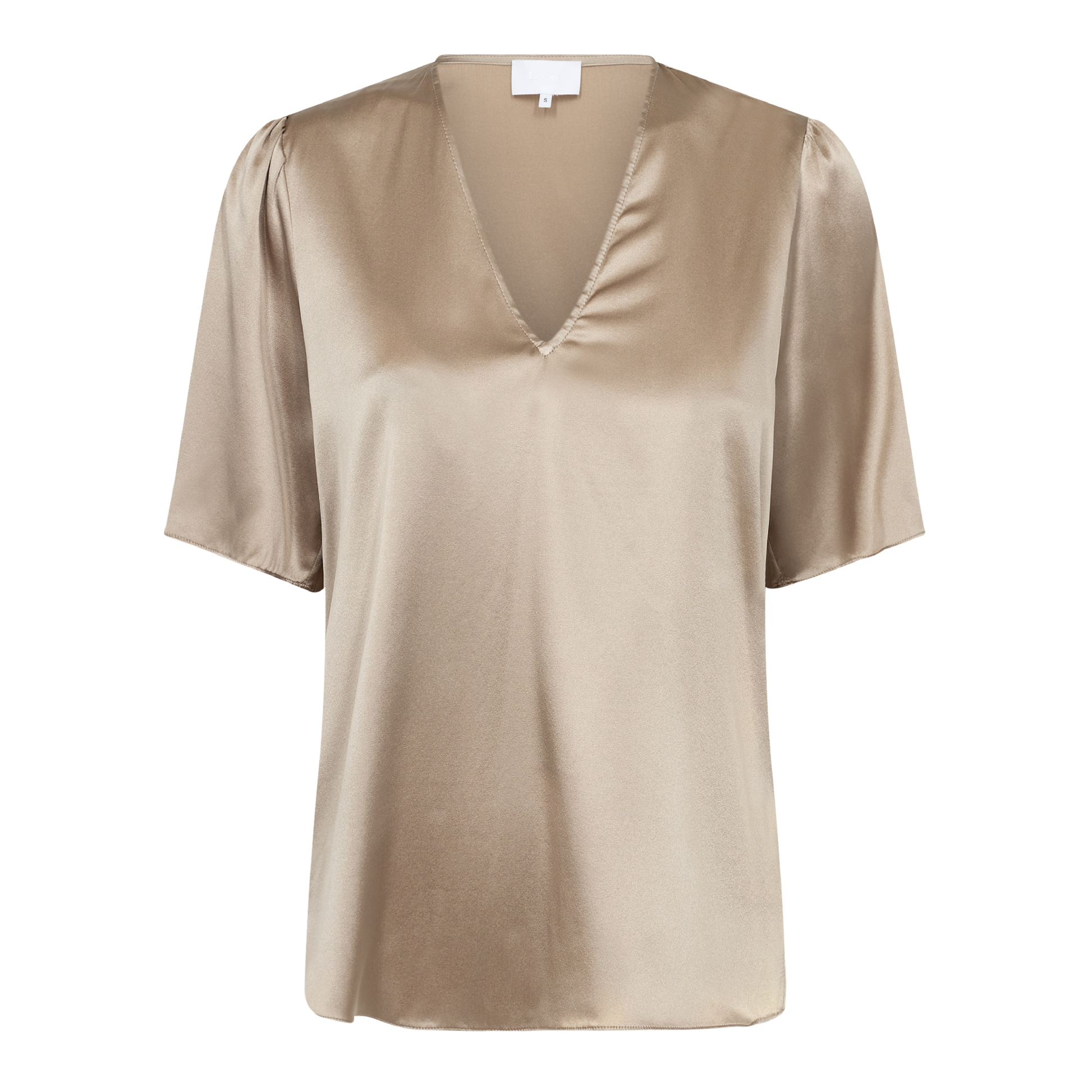 Smuk og enkel kortærmet skjorte fra Levete, i den skønneste silkekvalitet. En feminin bluse med v-udskæring, lægdetaljer ved skuldrene og korte, voluminøse ærmer. Passer perfekt til både festlige begivenheder og til hverdagsbrug, da du kan style den som du vil.