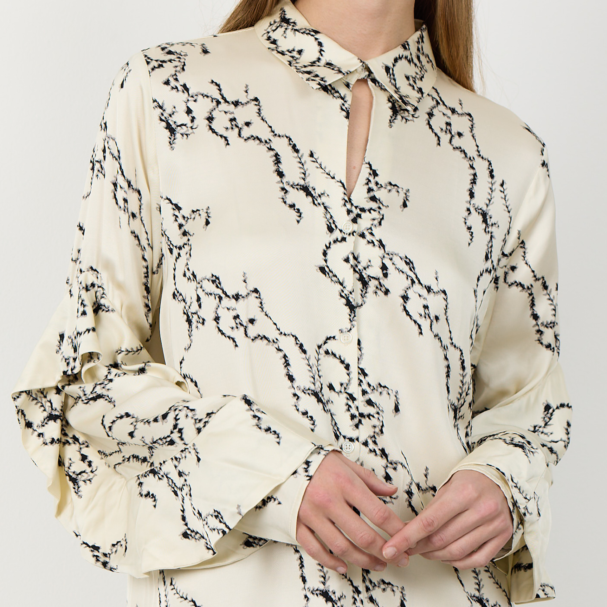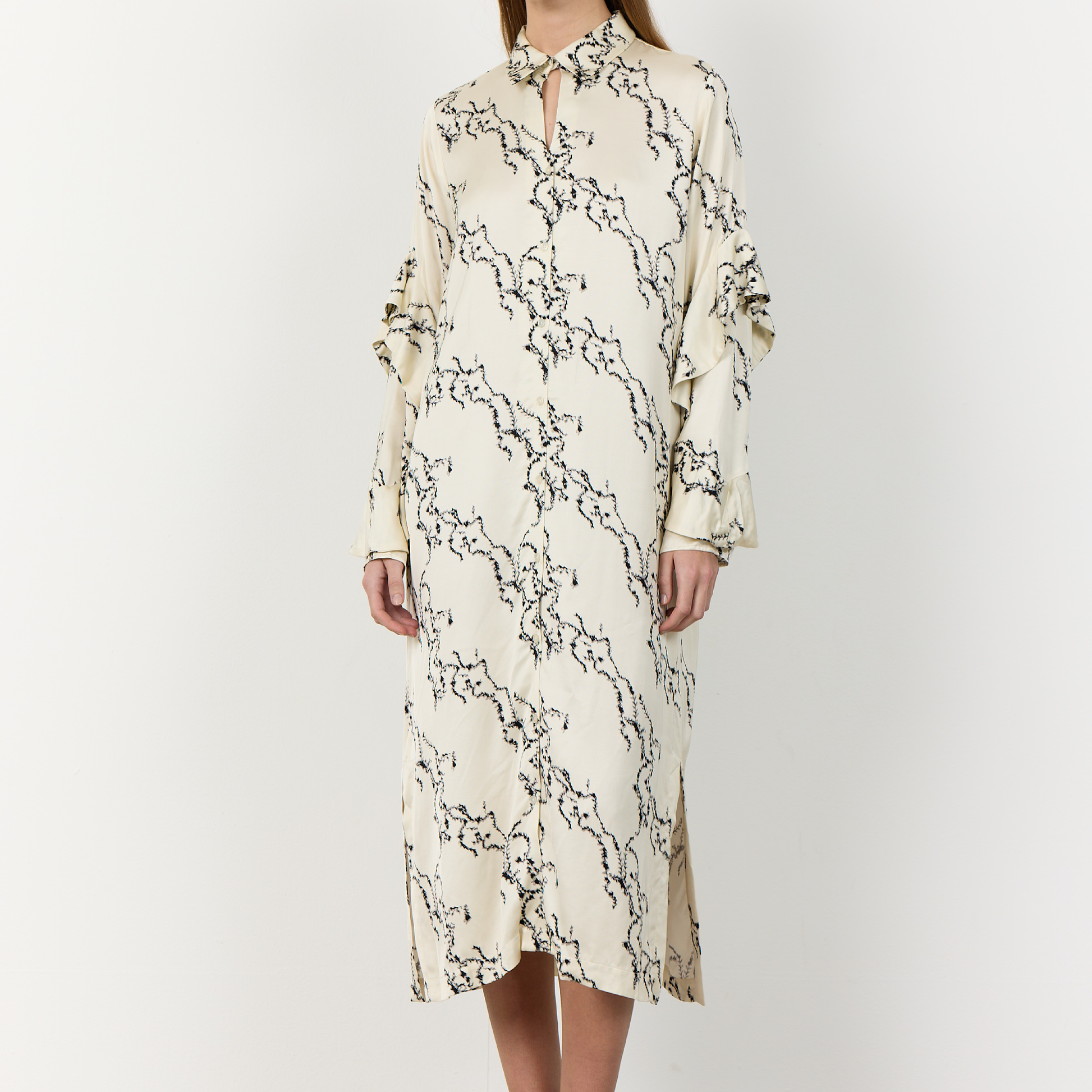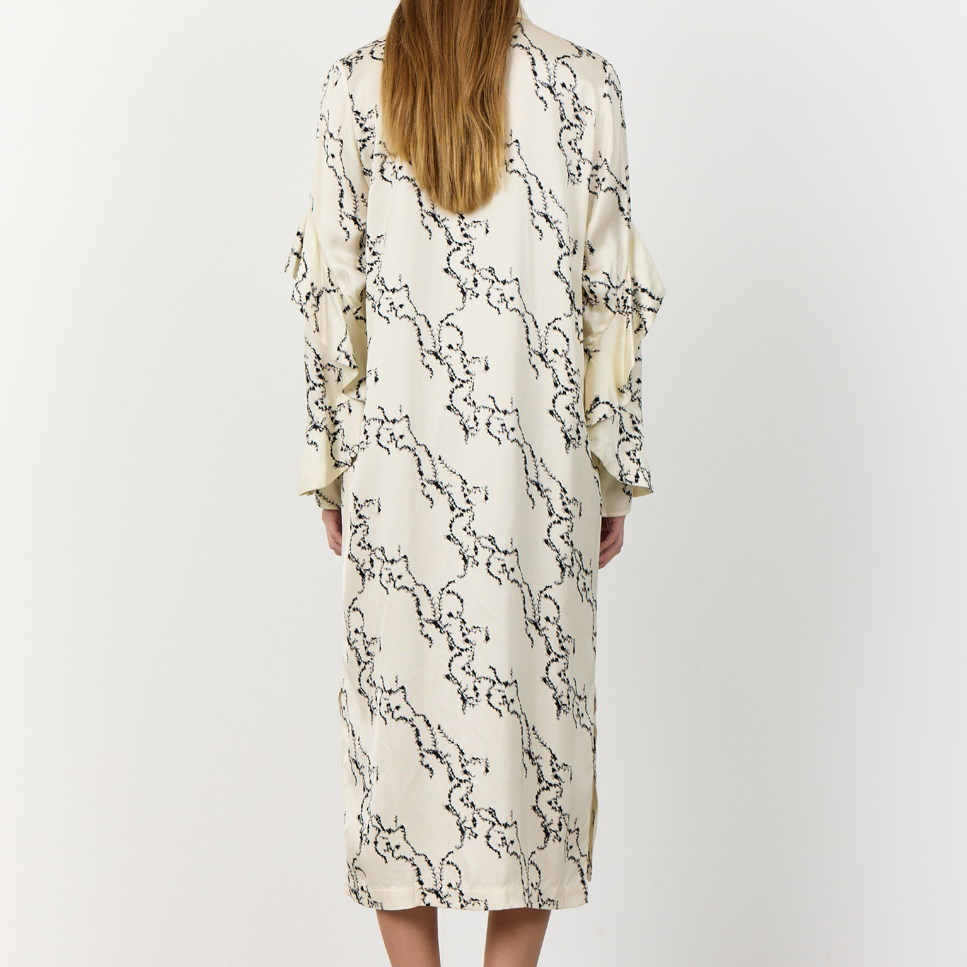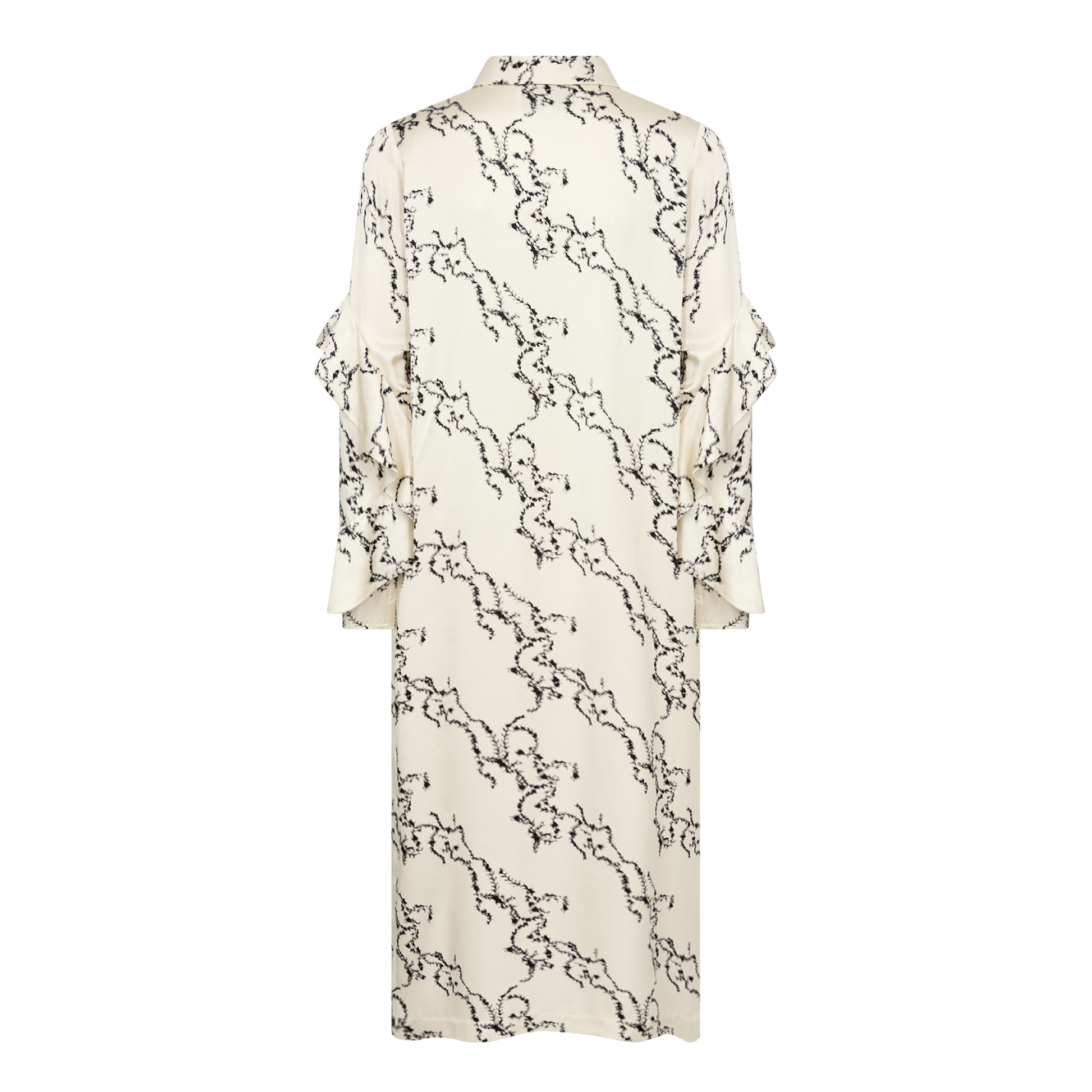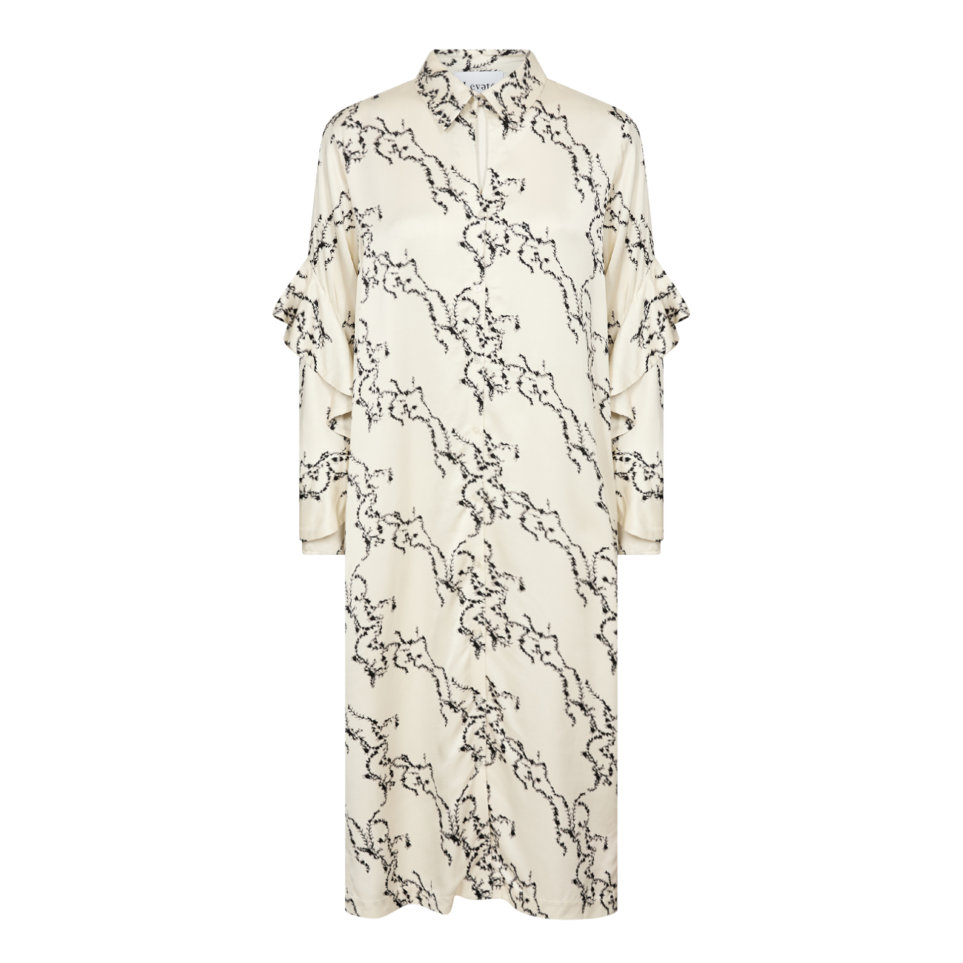 Den skønneste kjole fra Levete Room, i en let viskose kvalitet. Kjolen har en klassisk krave, knaplukning foran, lange ærmer med flæser og er fremhævet med et unikt abstrakt print.