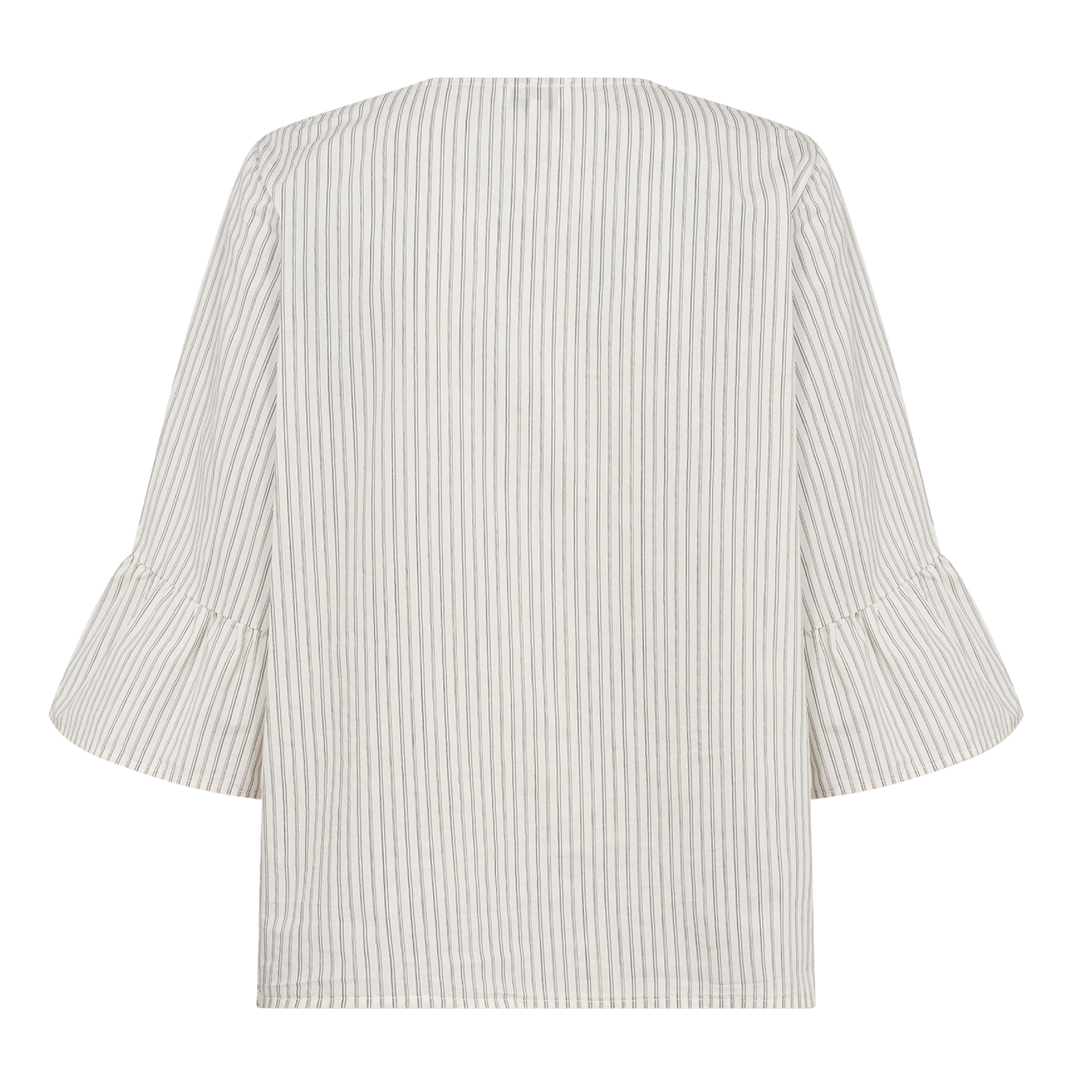 Den smukke Perrin 2 top fra Levete Room. Blusen har en flatterende V-udskæring, knaplukning foran, trekvart udspilede ærmer og et diskret stribet mønster.