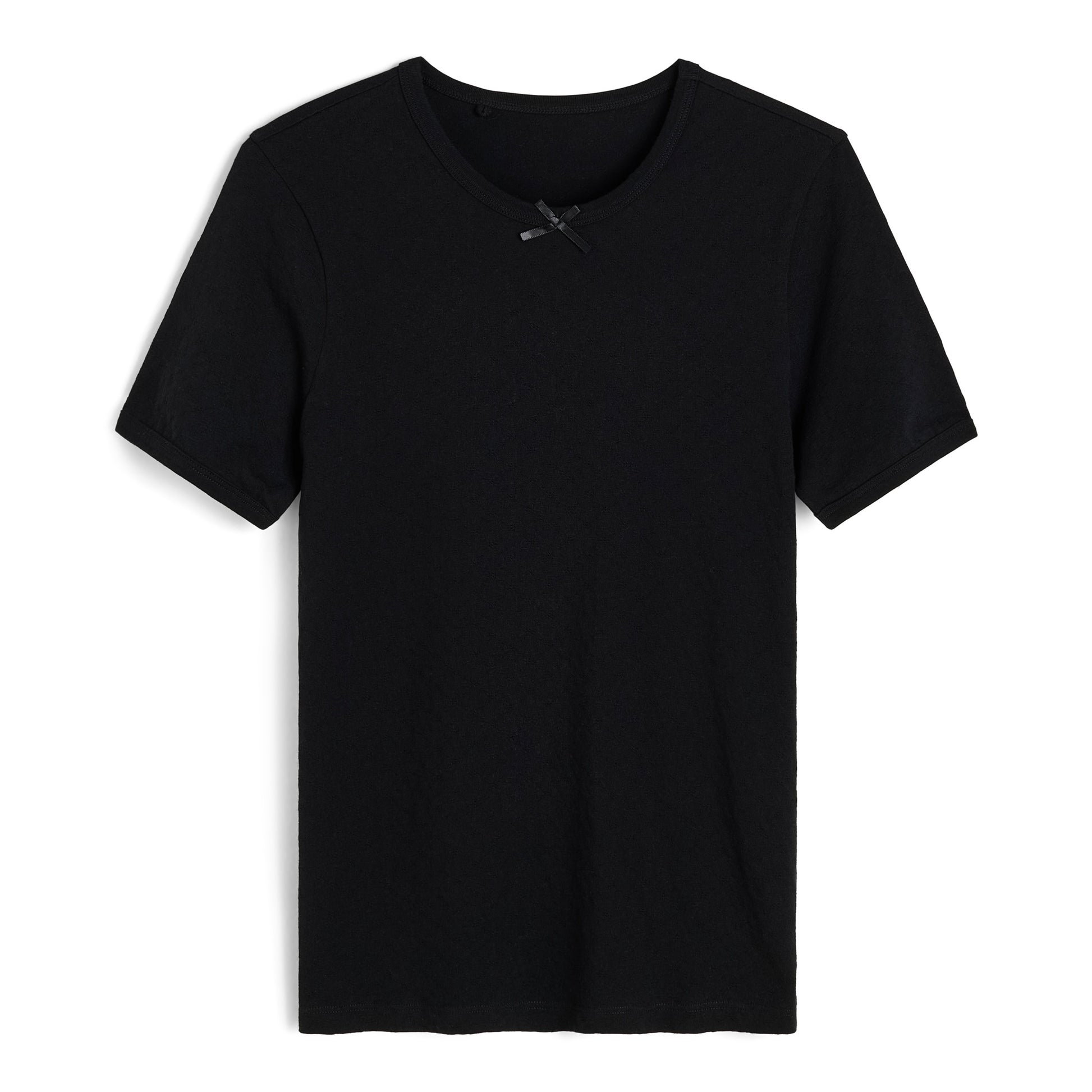 En klassisk t-shirt fra Aiayu, fremstillet i pointelle-inspireret mesh jersey - der giver et delikat og detaljeret udtryk. T-shirten har en dekorativ sløjfedetalje midtfor samt ribkanter ved halsen og ærmerne. Designet i et lige snit der skaber en elegant og feminin silhuet.