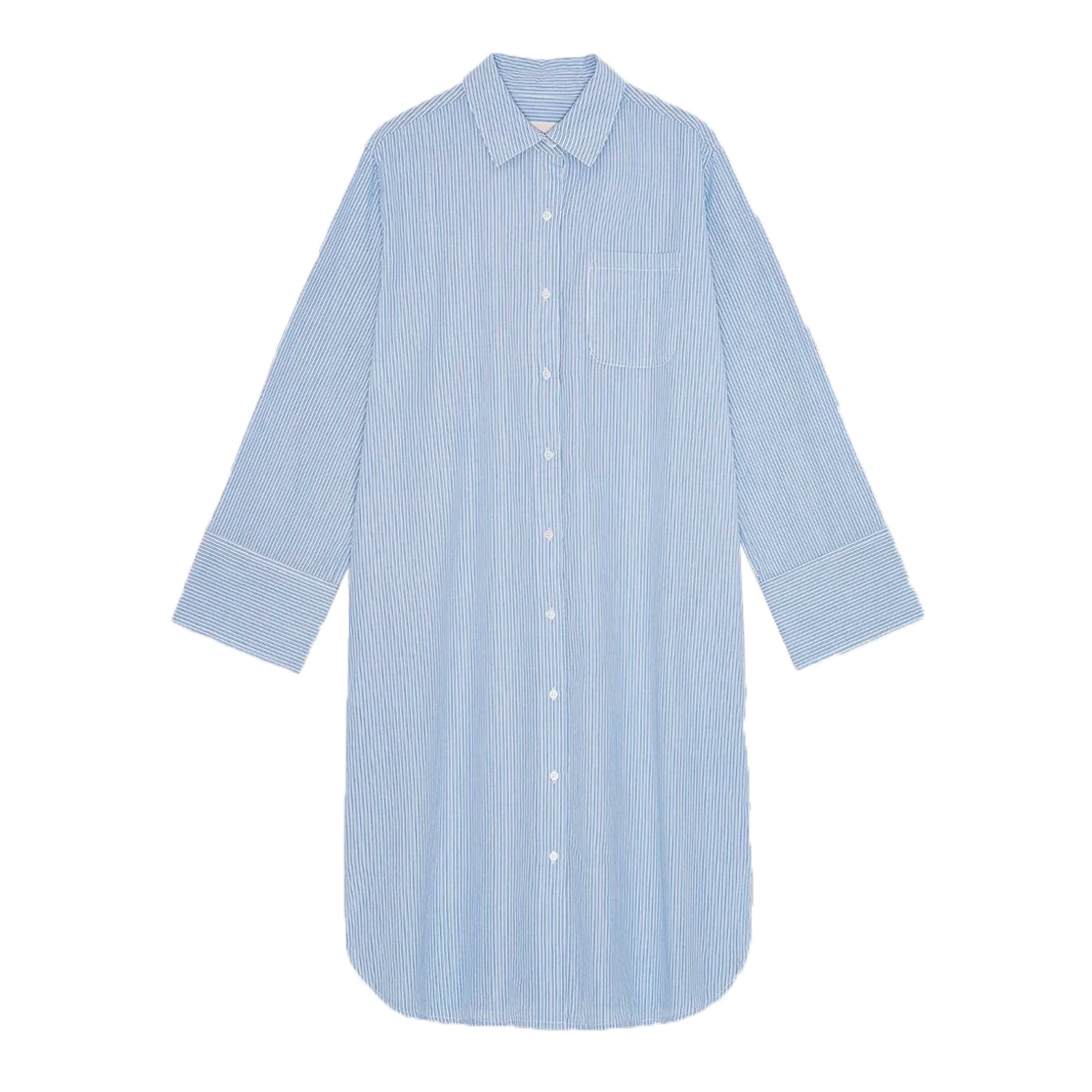 Finstribet skjortekjole i oversize snit og fuld knaplukning. Skjortekjolen har en klassisk skjortekrave, brystlomme og brede manchetter. Bemærk den diskrete læg bagtil, afrundede bundsøm samt sideslidser, som giver skjorten et smukt fald.