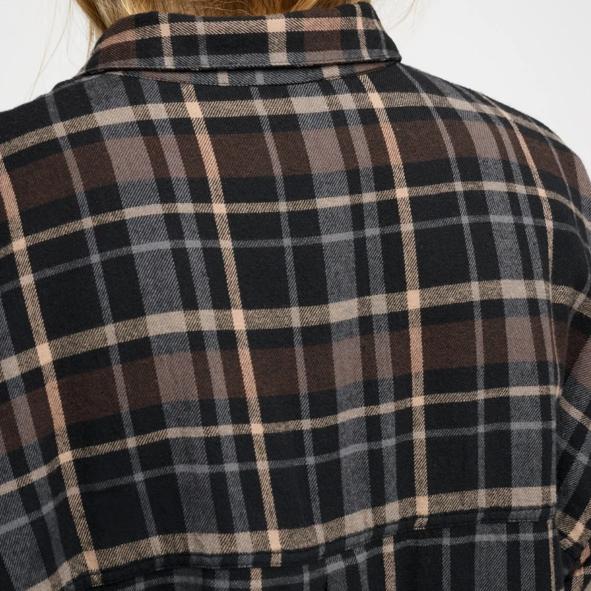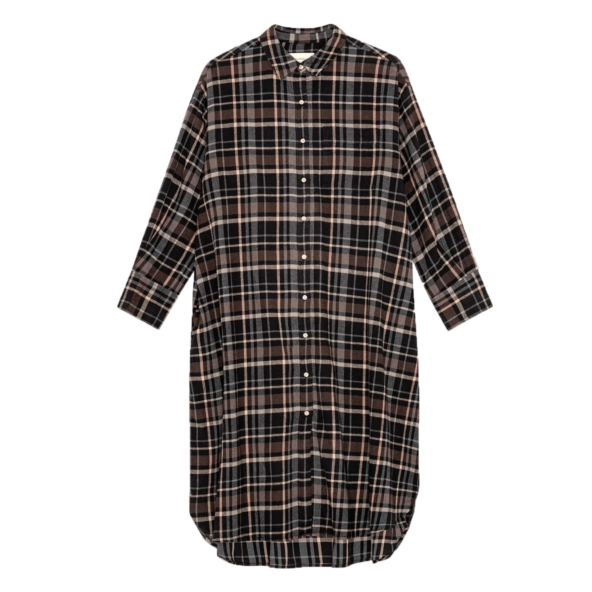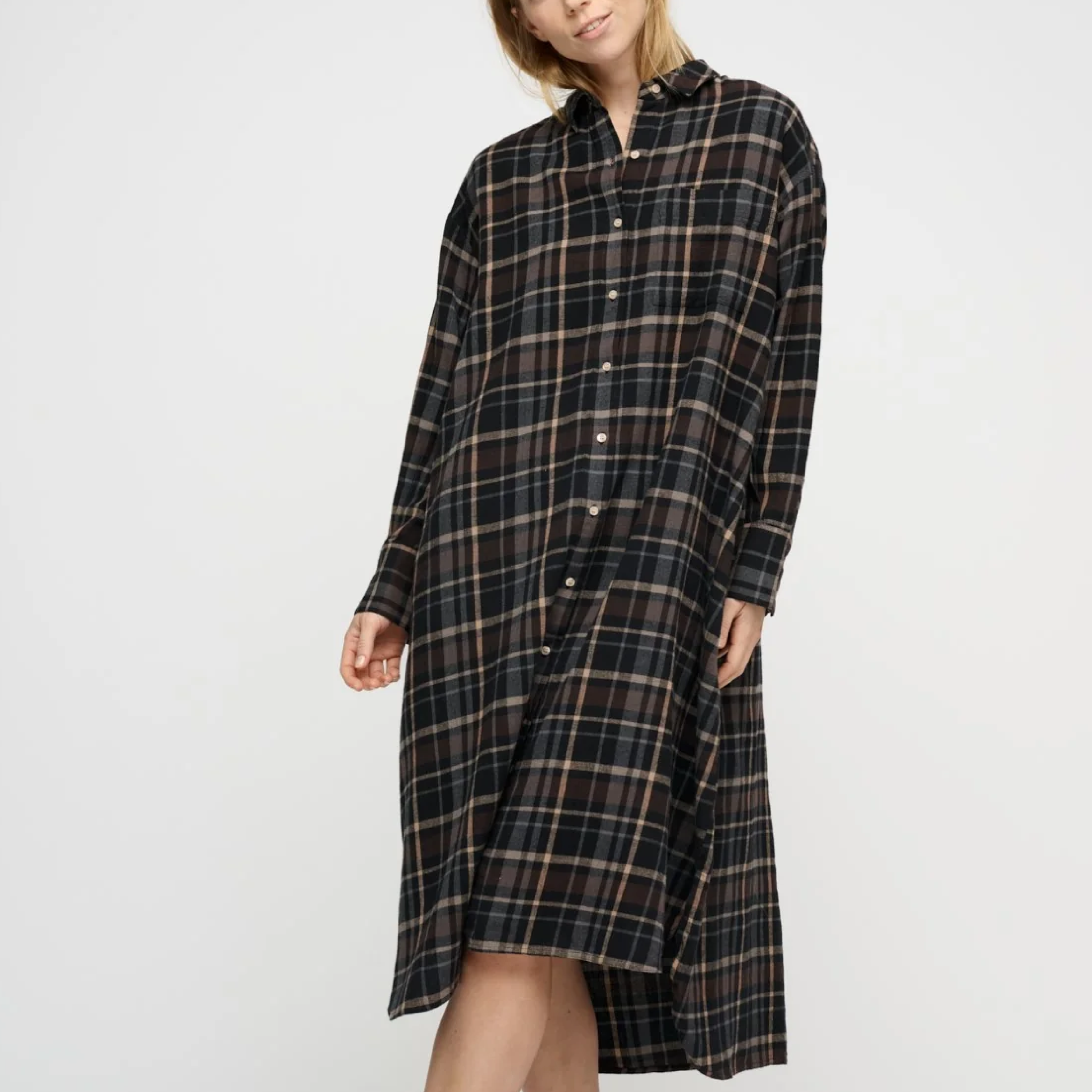 Skjortekjole i løs a-formet silhouet med dekorative tern. Skjortekjolen har en klassisk skjortekrave, brystlomme, knaplukning og knapmanchetter. Bemærk den diskrete læg bagtil samt sideslidser, som giver skjorten et smukt fald.