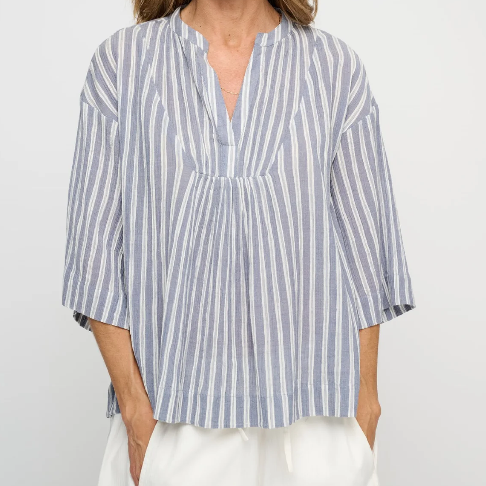 Stribet, let skjorte med v-udskæring, peplum og voluminøse mellemlange ærmer. Bemærk toppens dekorative fald, både for og bagtil.