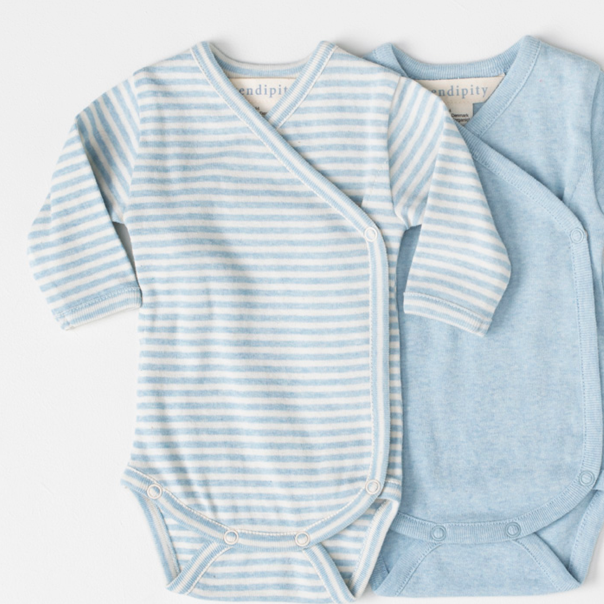 Blød langærmet slå-om body i de fineste striber fra Serendipity Organics. Body'en er fremstillet i en blød økologisk bomuld, og lukkes med trykknapper i siden og ved bleen.