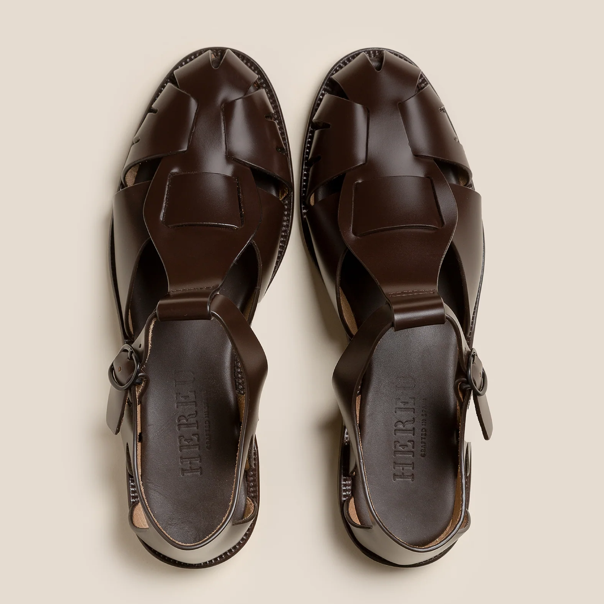 Den klassiske Pesca sandal i farven 'dark brown' fra HEREU. Sandalen er håndsyet i spanien med traditionelle mokkasinkonstruktion i spansk kalveskind, og lukkes med et justerbart spænde foran.