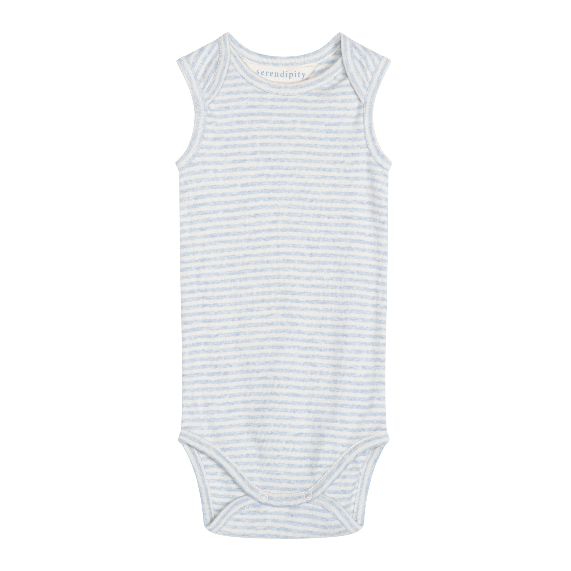 Blød kortærmet body i de fineste striber fra Serendipity Organics. Body'en er fremstillet i en blød økologisk bomuld, og lukkes med trykknapper ved bleen.