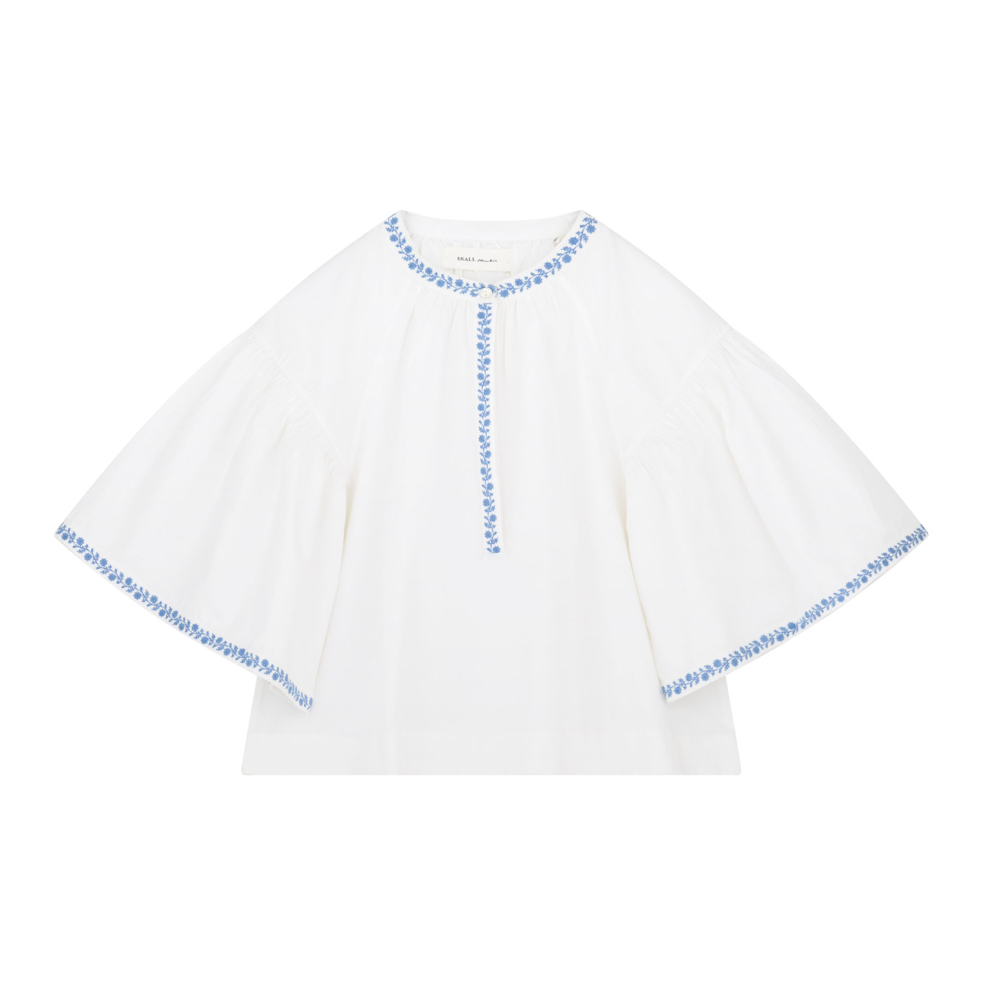 Den fine Bonne top fra Skall Studio. Kort bluse med halvlange, voluminøse ærmer og broderede detaljer.