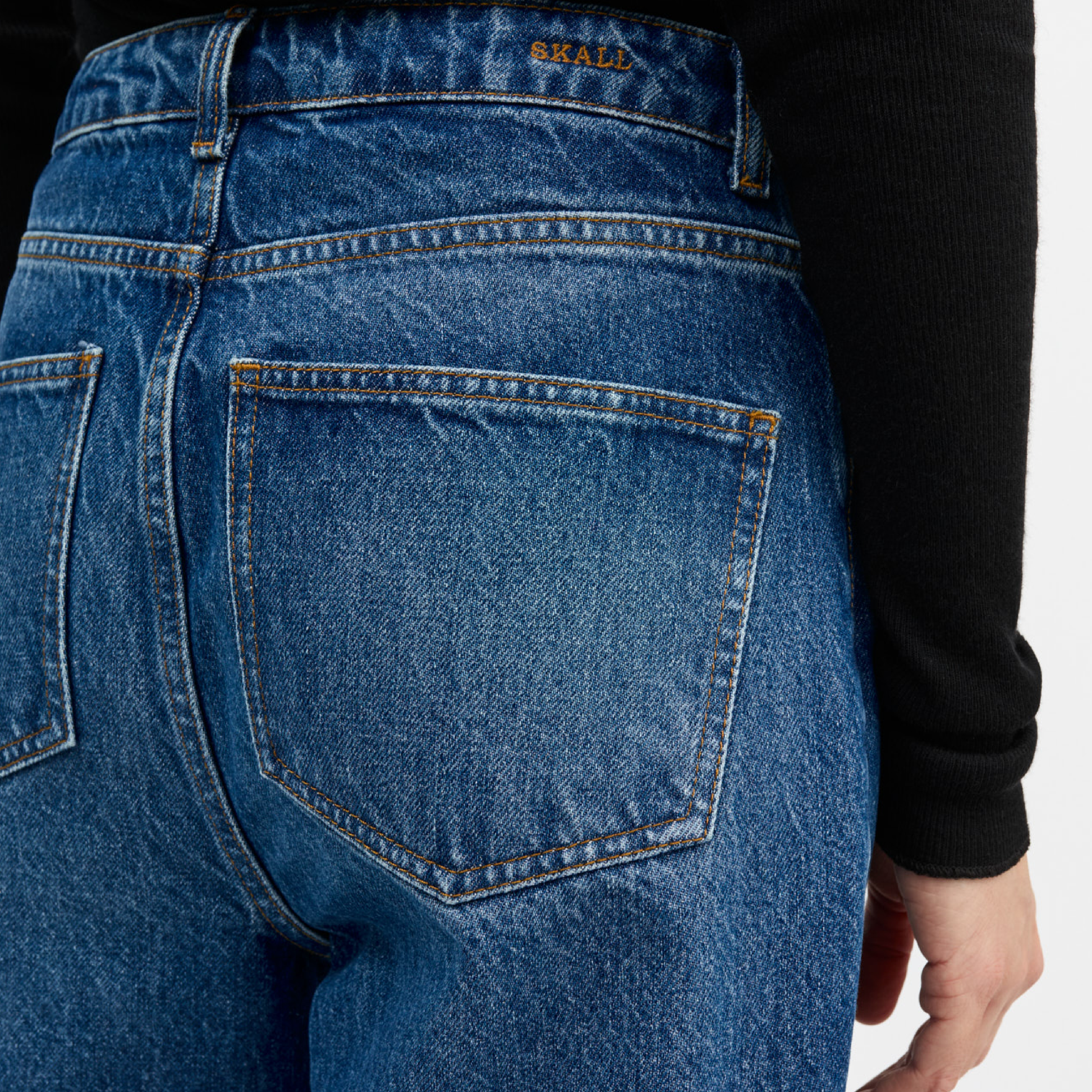 Maddy Straight Jeans fra Skall Studio, i en smuk blå vask. De smukke jeans er fremstillet i økologisk bomuld, og er en del af Skall Studios GOTS-certificerede denimlinje. De har et klassisk five pocket-udtryk samt bæltestropper. På linningen bagpå har de et broderet SKALL-logo.v