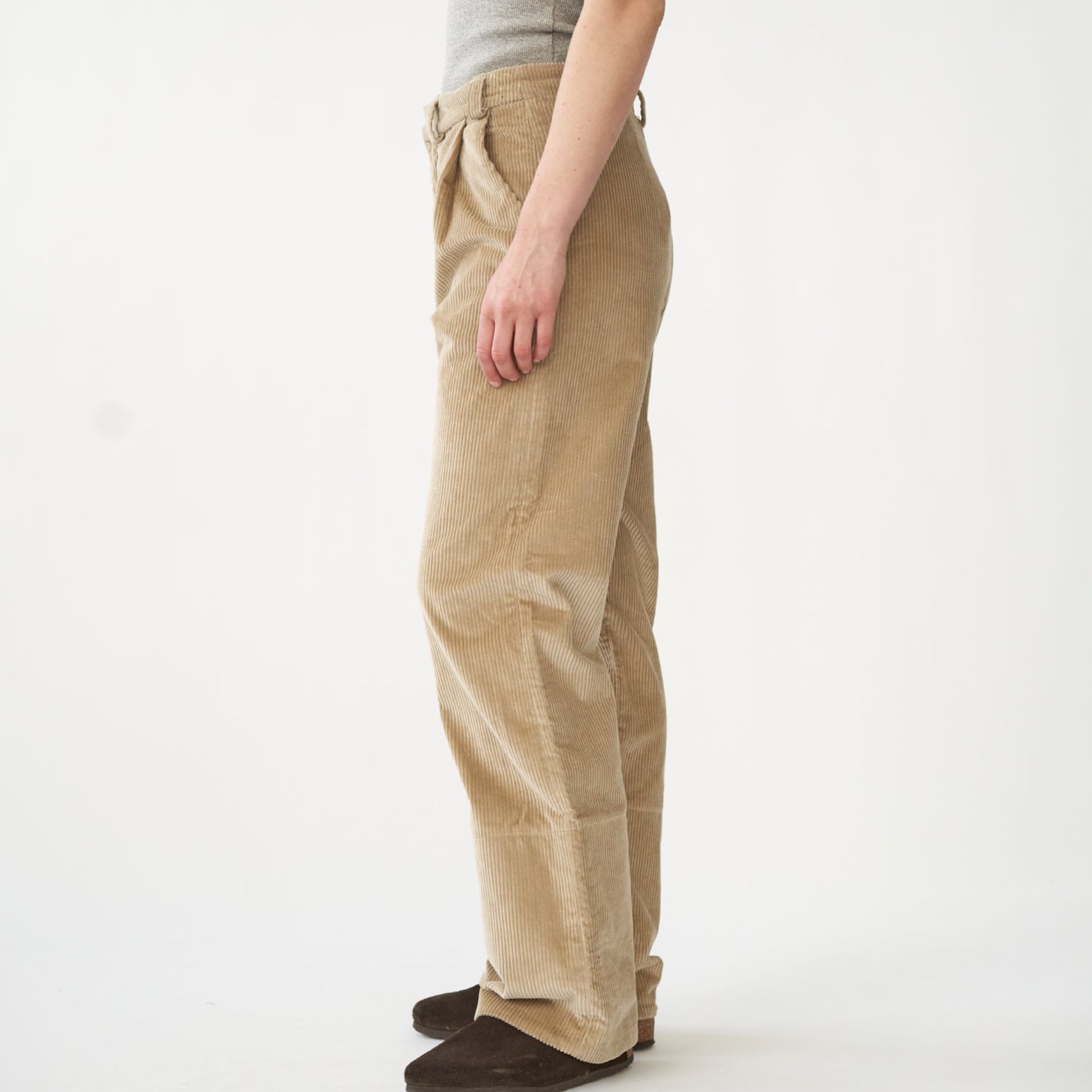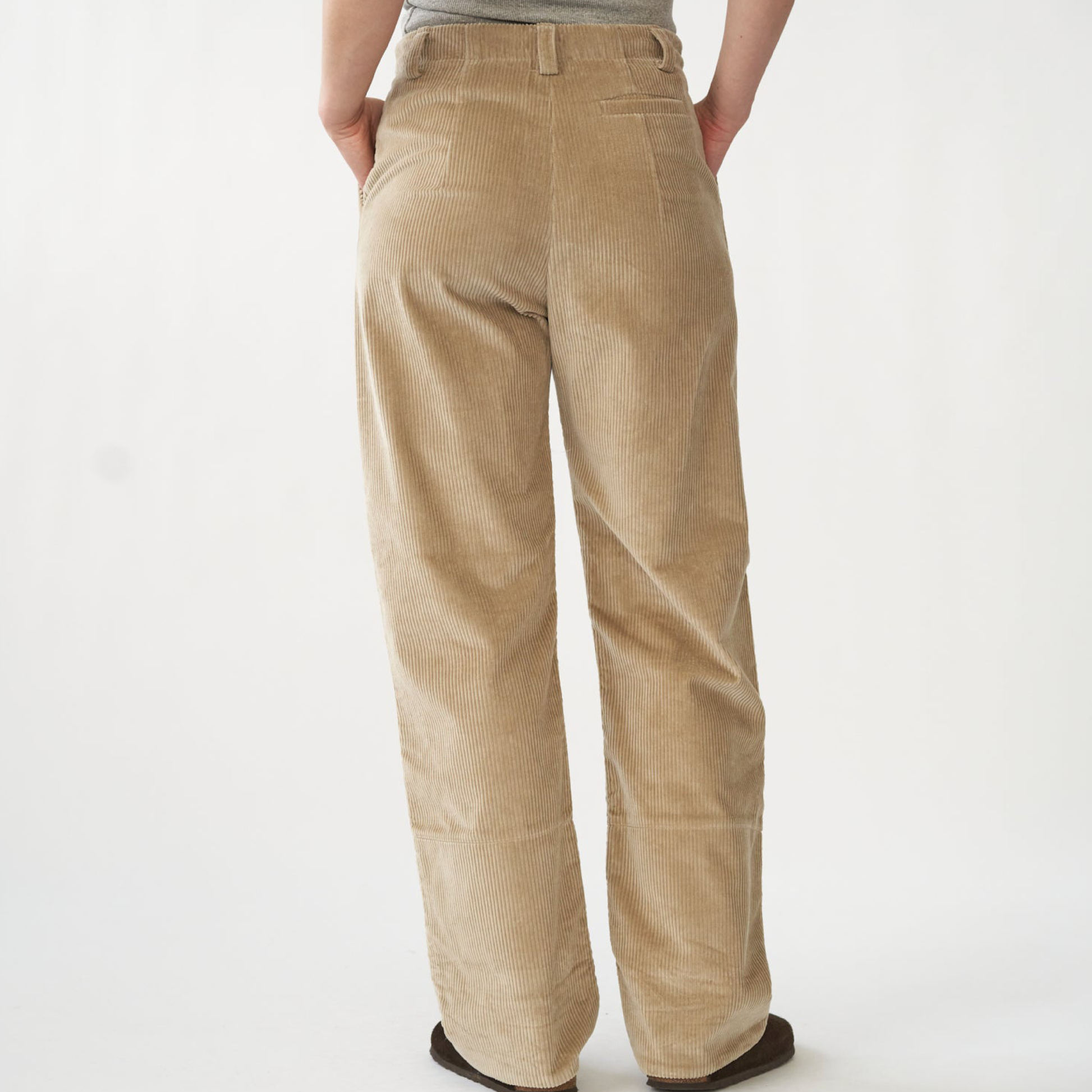 Corduroy Box Trousers fra AF Agger. Bukser i fløjl i smuk beige farve. Bukserne har læg foran og lukkes med lynlås og en skjult krog og knap. De har sidelommer og en enkelt lomme bagpå - samt en oversize og løs pasform.