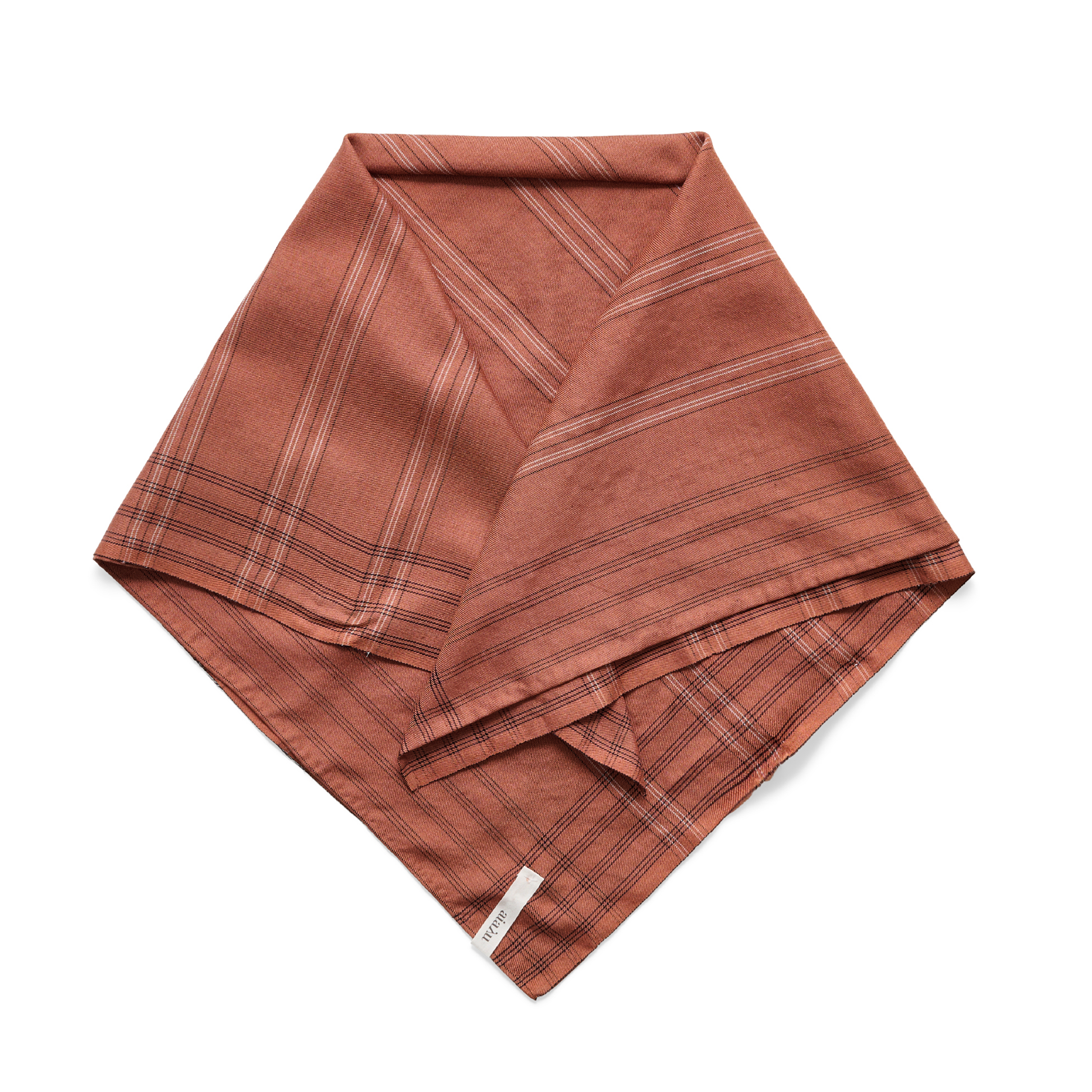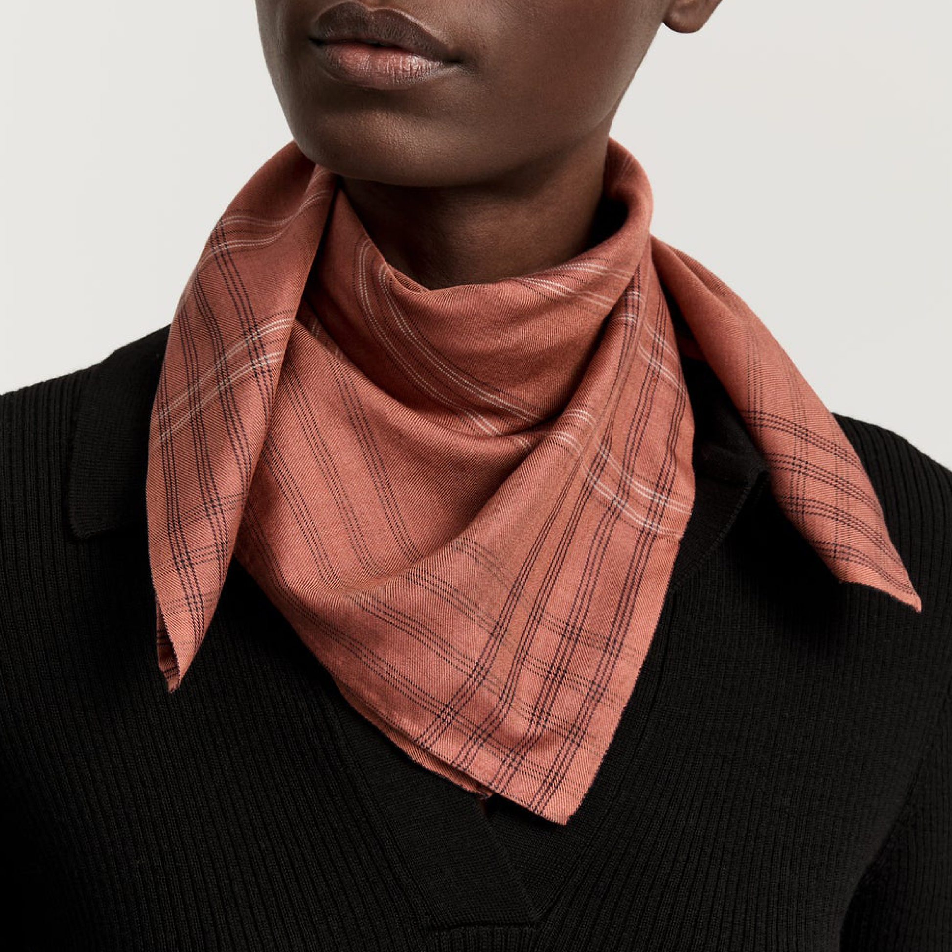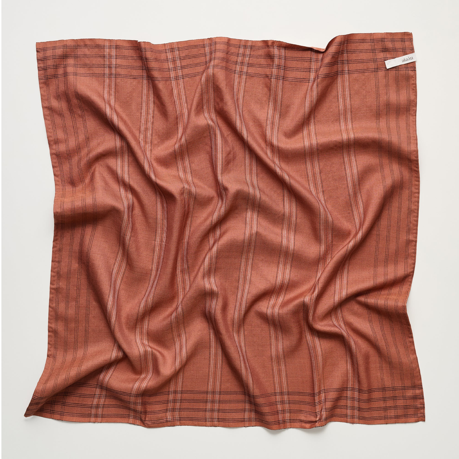 Et elegant, kvadratisk tørklæde håndspundet i silke på traditionelle nepalesiskehåndvæve. Tørklædet er detaljeret med en enkel foldning, et aiayu-logo og smukt, ternet mønster.