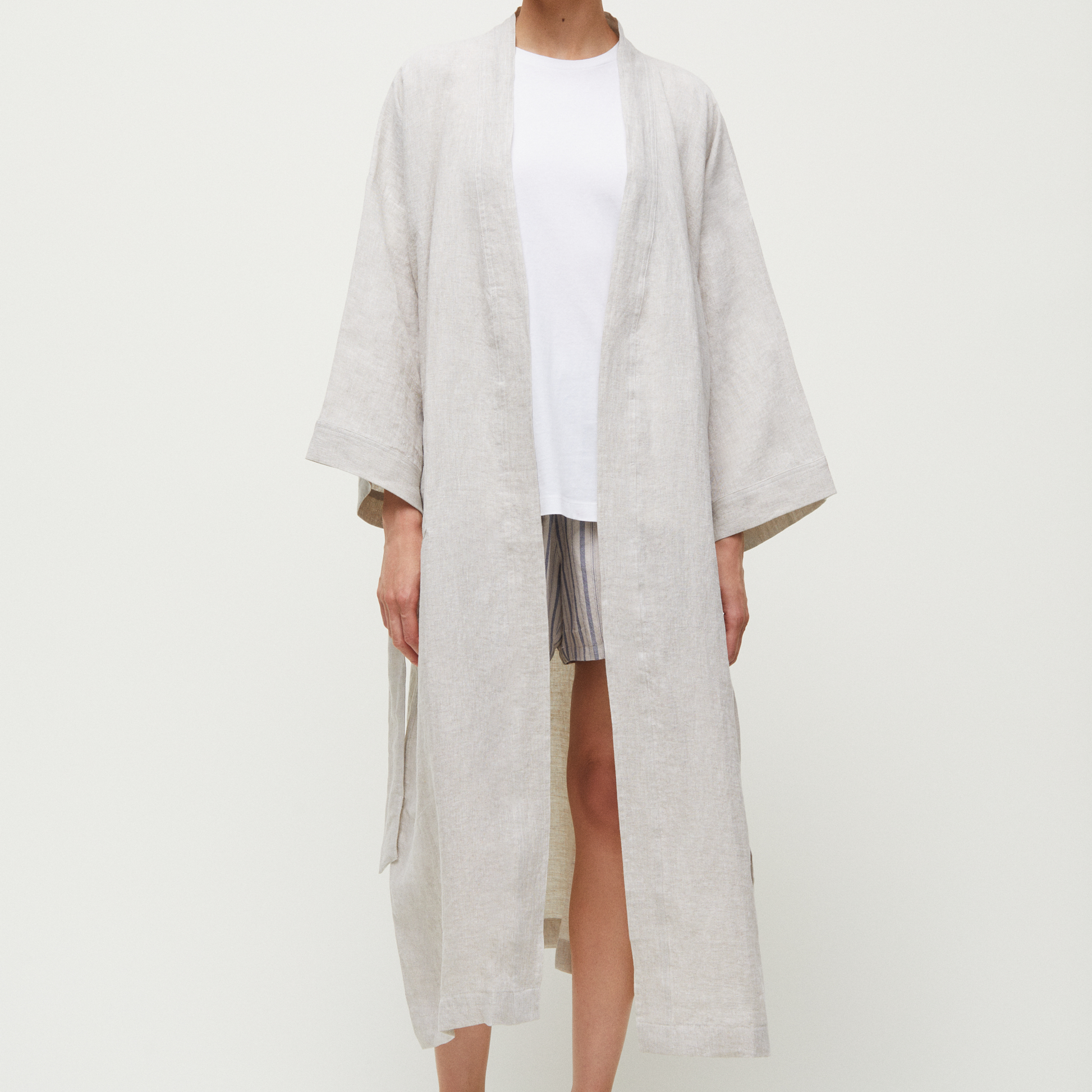 Klassisk unisex morgenkåbe med arkitektoniske ærmer, brede sømme, dropped shoulders og bindebånd fra Aiayu. Fremstillet af 100% europæisk hør, som er exceptionelt åndbar, let og samtidig holdbar - en tidløs favorit.