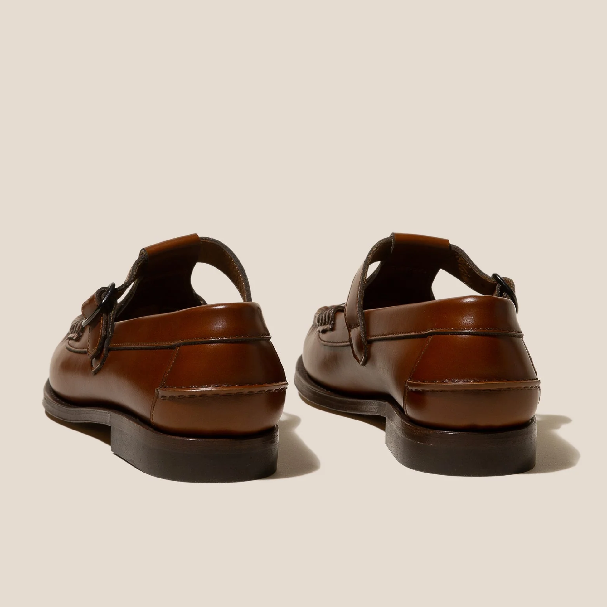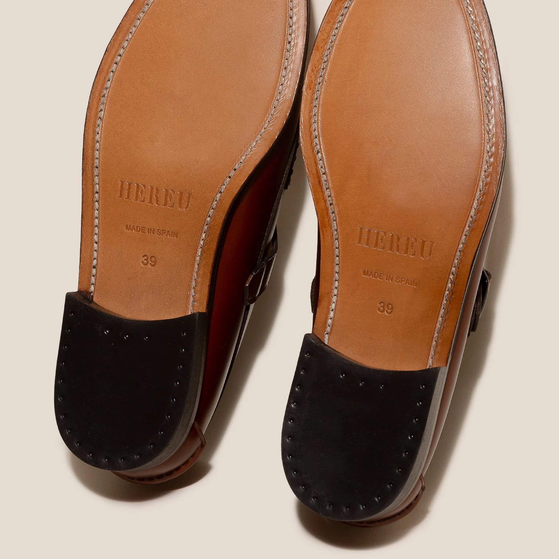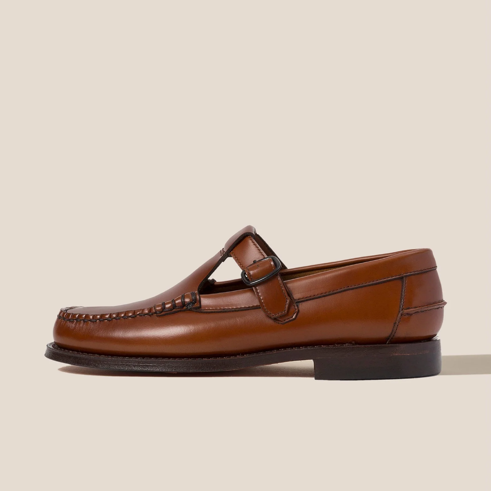 Den klassiske Alber t-bar loafer i farven 'tan' fra HEREU. Skoen er håndsyet i spanien med traditionelle mokkasinkonstruktion i spansk kalveskind, og lukkes med et justerbart spænde foran.