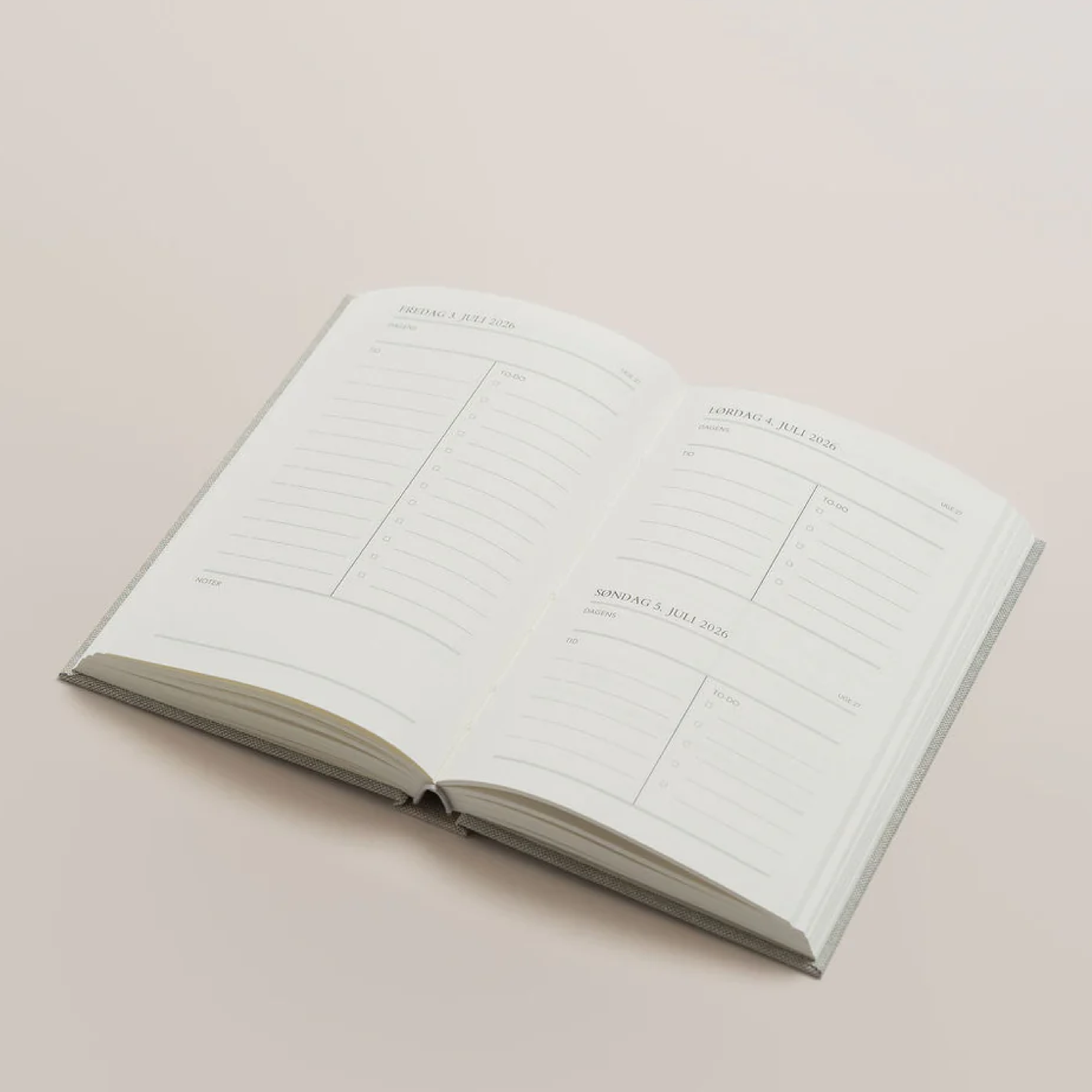 Dagskalenderen dækker januar - december 2026 med én dag per side (fælles side til weekenddagene). Designet samler dine kort- og langsigtede planer og har plads til alt fra månedens drømme og intentioner til dagens huskelister.