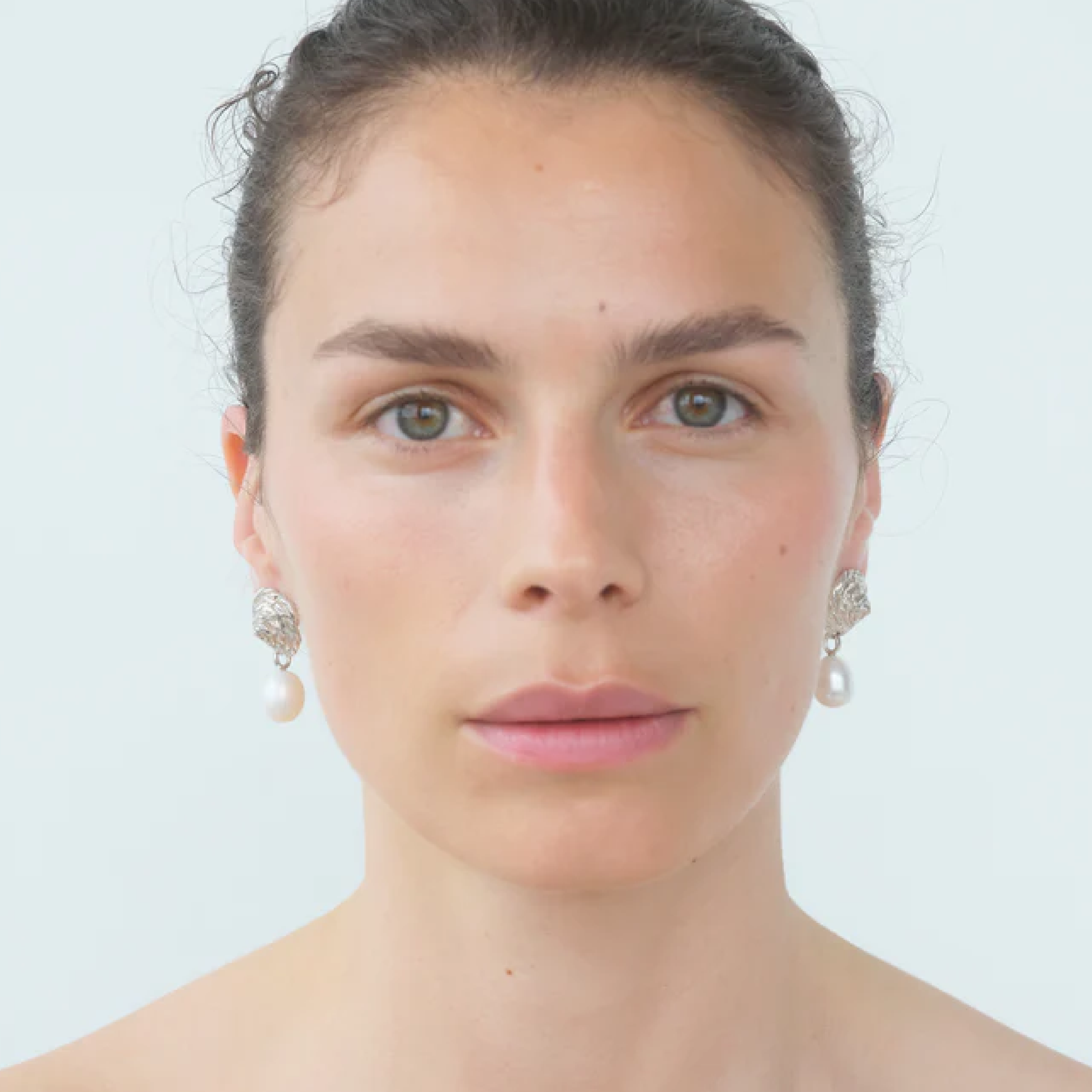 Håndlavede øreringe fra Corali, fremstillet i genanvendt sterlingsølv. Breton Pearl Earrings er formet som rosenknopper med AA-ferskvandsperler, der hænger smukt. Øreringene har en stiklås på bagsiden og leveres med butterfly-lås.