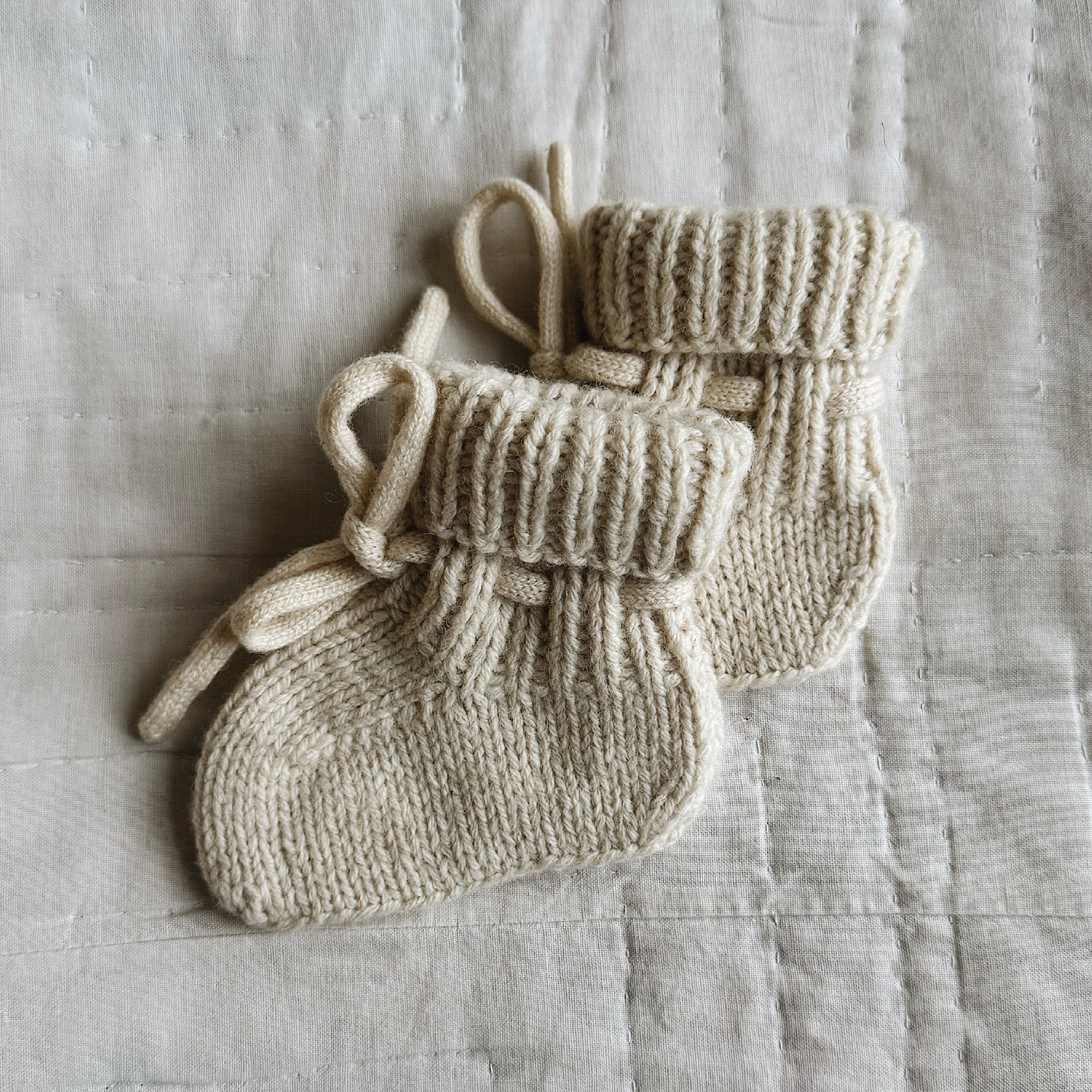 Cony futterne fra det fine danske brand, Lalaby. Futterne er håndstrikket i den blødeste kvalitet, og lukkes med en blød snor om anklen - så de sidder godt på de små fødder.
