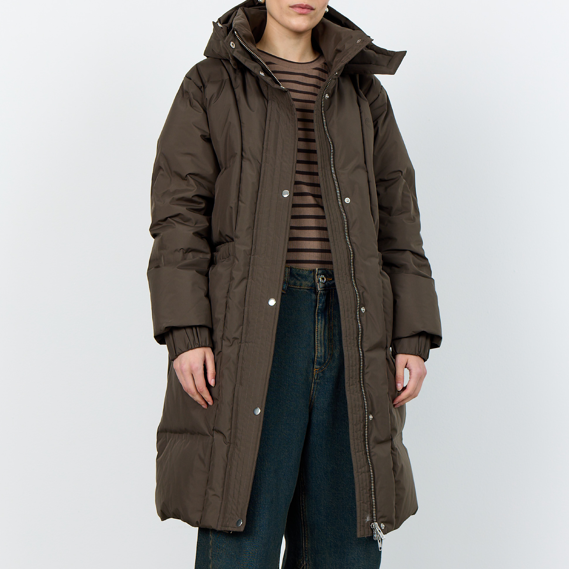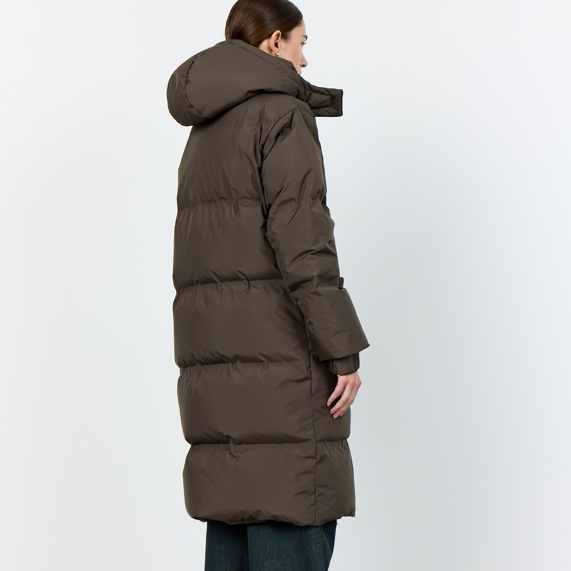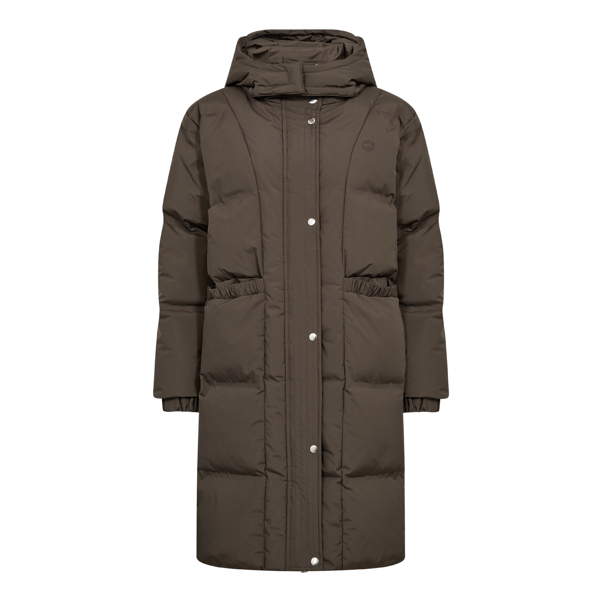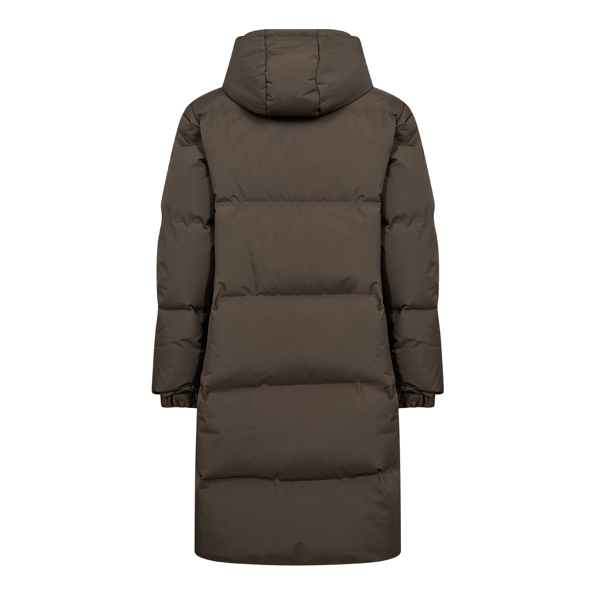 Skøn og varm dunjakke fra Levete. Jakken har en høj krave, knapper, en lang længde og et quiltet design.