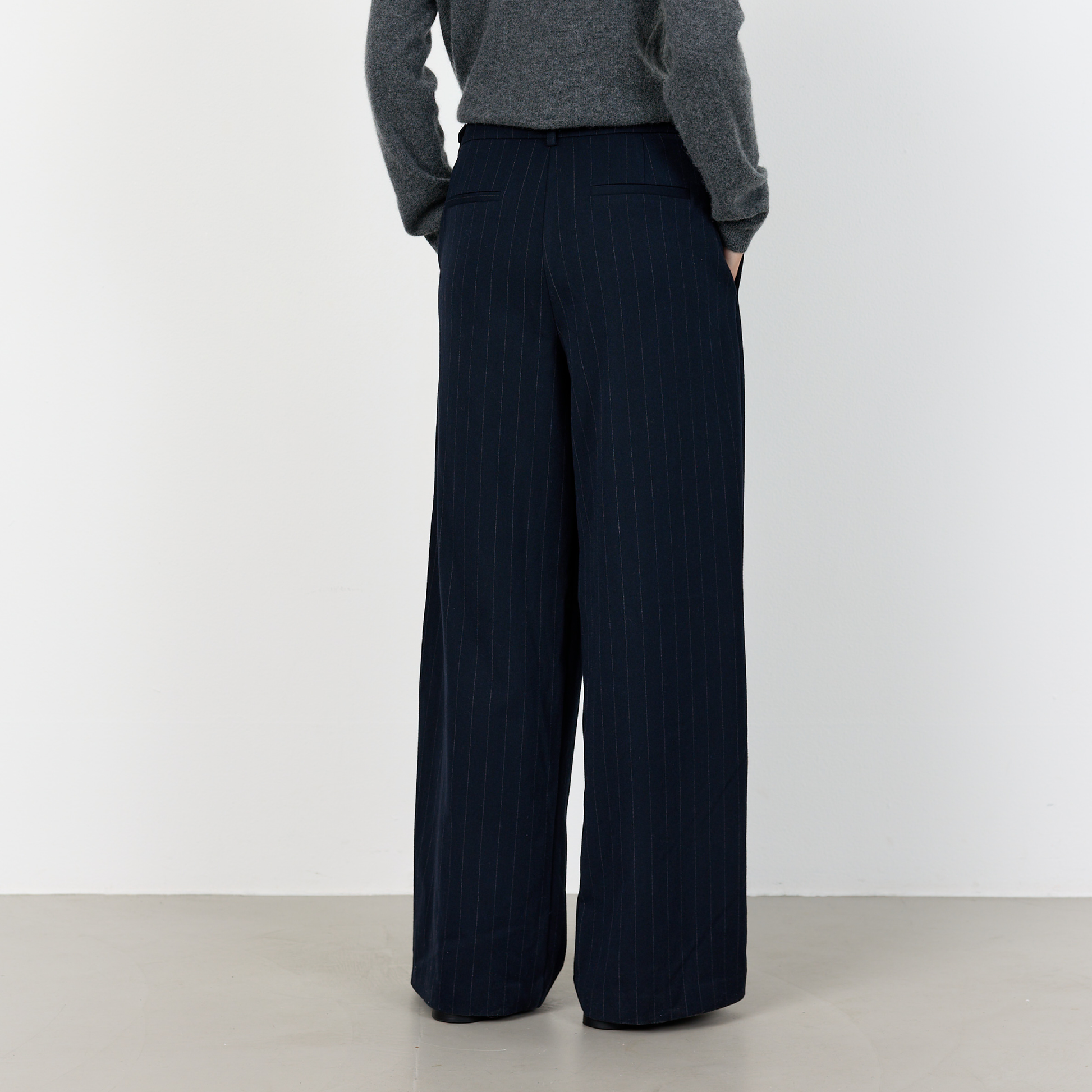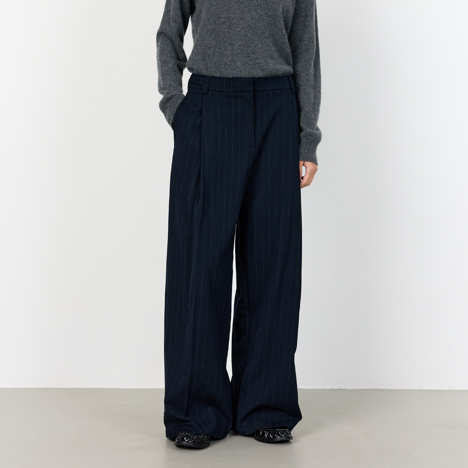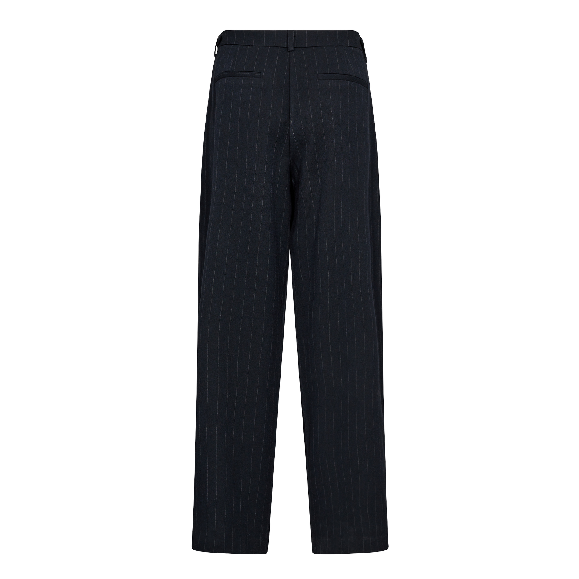 De fine Olivia 2 bukser fra Levete Room. Disse elegante bukser har et diskret nålestribet mønster og et flatterende, hellangt snit.