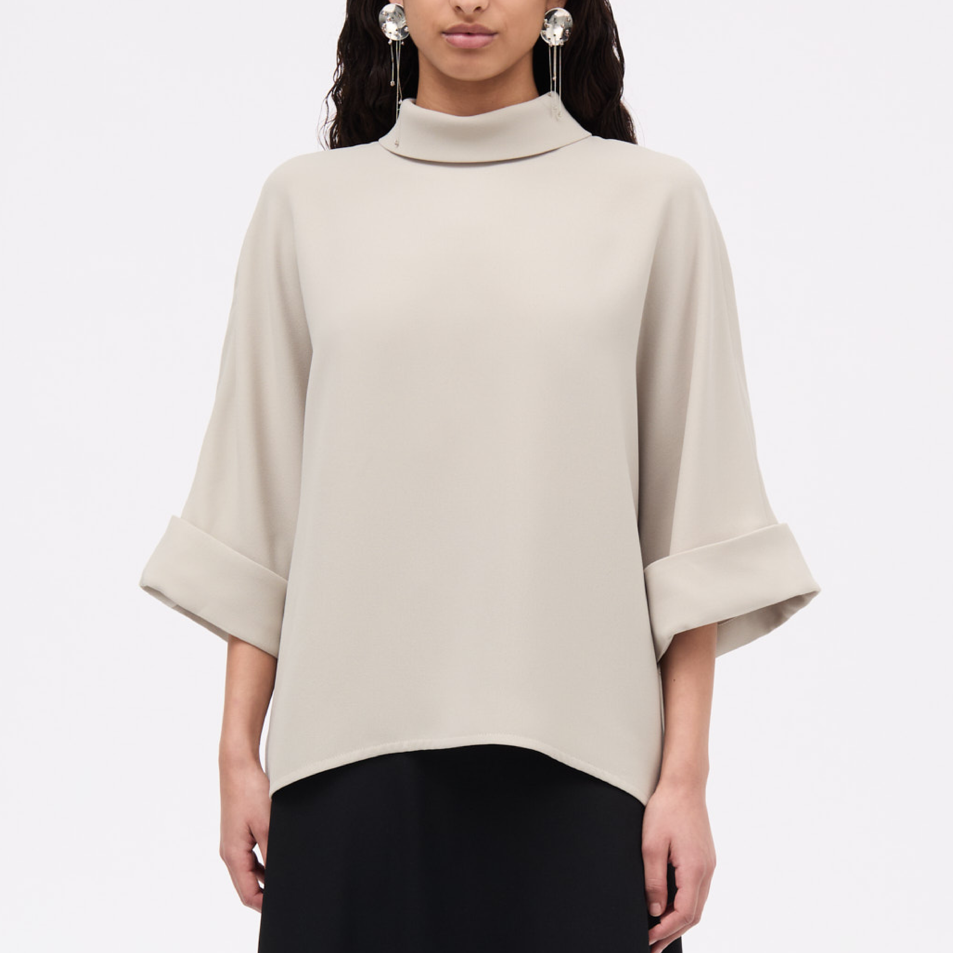 Den smukke og klassiske Bailee top fra MKDT Studio. Toppen har et elegant snit med en smuk stående krave, 3/4 ærmer med opsmøg og lukkes med en enkelt knap i nakken. Brug toppen begge veje - for to forskellige looks.