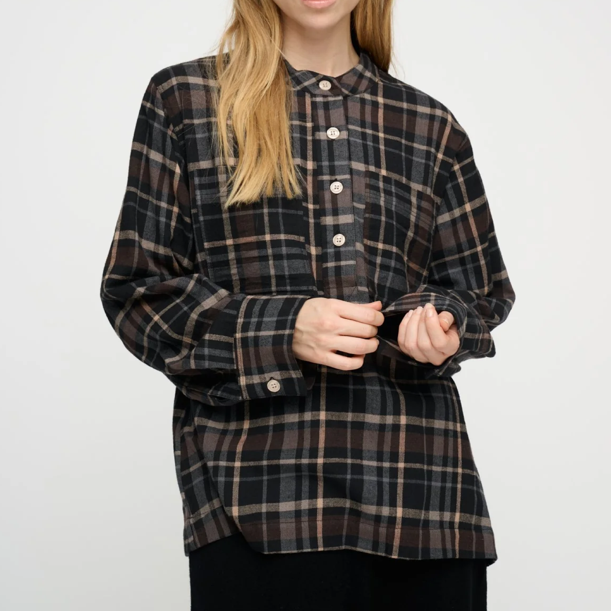 Brunternet skjorte med rund hals og halv knaplukning fortil. Skjorten har manchetter med knaplukning ved ærmerne og brystlommer. Bemærk de diskrete, dekorative læg på rygstykket.