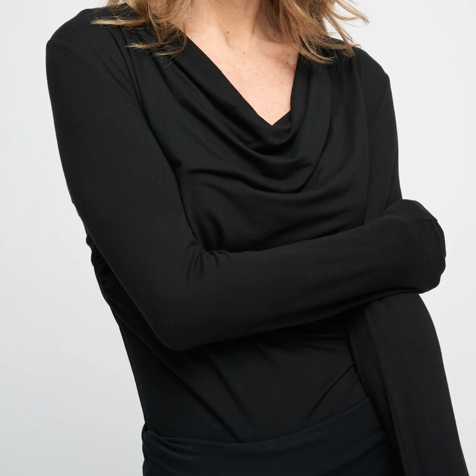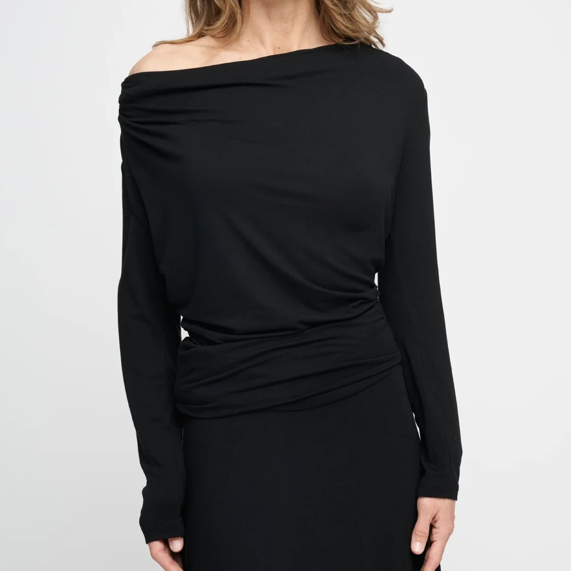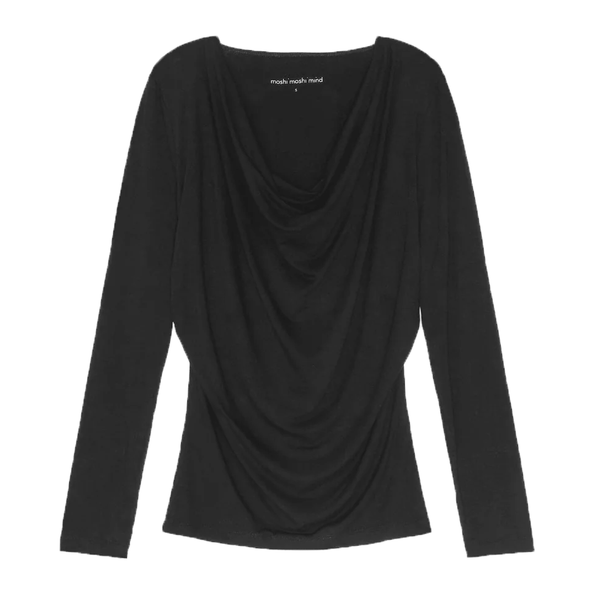 Feminin og silkeblød langærmet bluse fra Moshi Moshi Mind - med dekorativ, draperet halsudskæring og tætsiddende pasform. Bemærk at blusens drapering kan styles både over skulderen eller fortil.