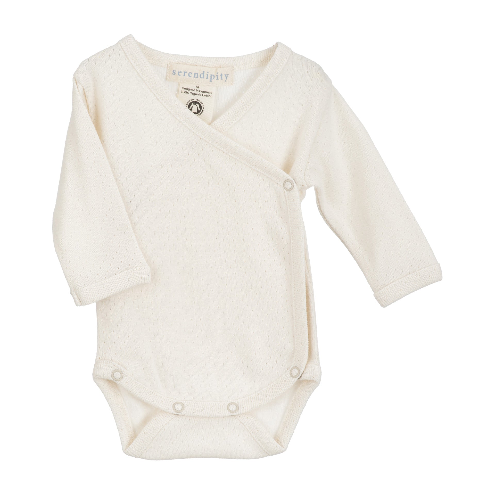 Blød langærmet slå-om body i det fineste hulmønster fra Serendipity Organics. Body'en er fremstillet i en blød økologisk bomuld, og lukkes med trykknapper i siden og ved bleen.