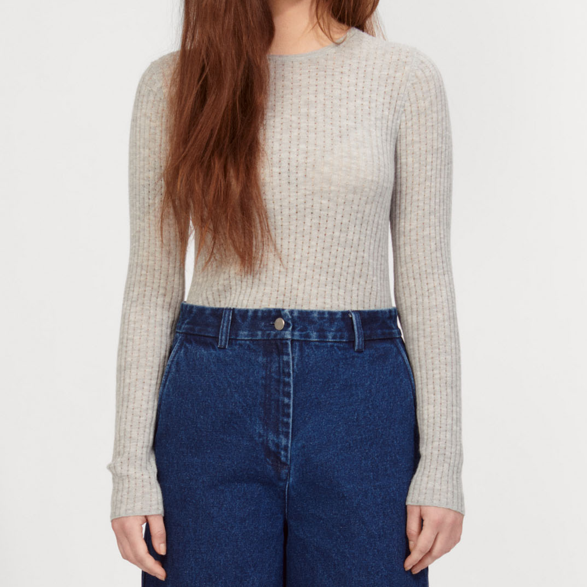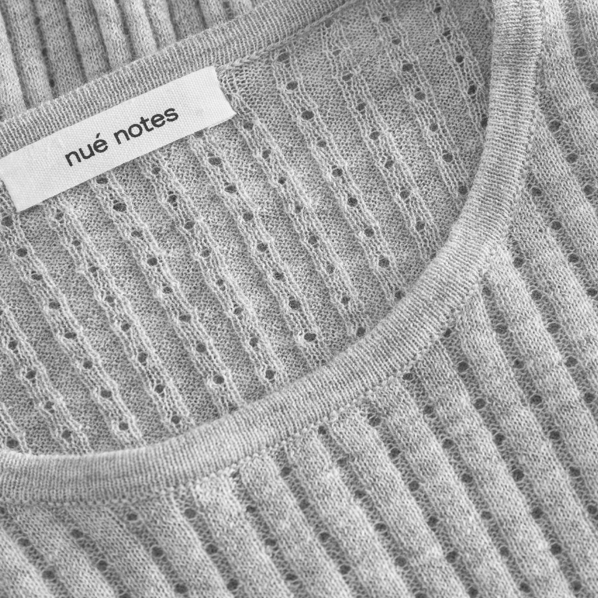 Den smukke Magnus strik fra Nué Notes, i den skønneste lysegrå farve. Langærmet strik i pointelle strik - og fremstillet i en skøn og blød uldkvalitet.