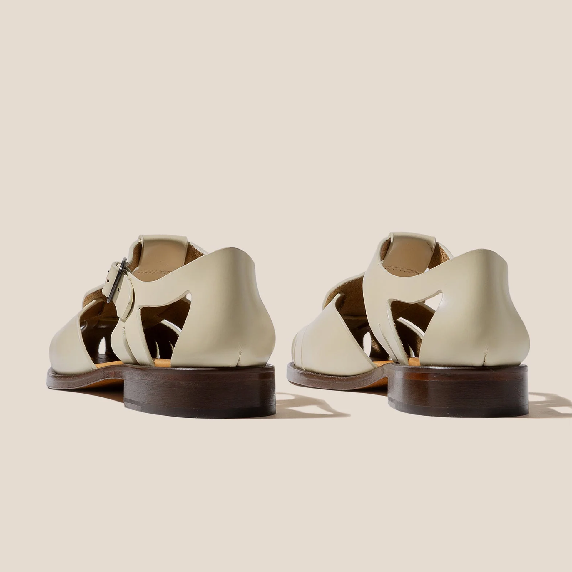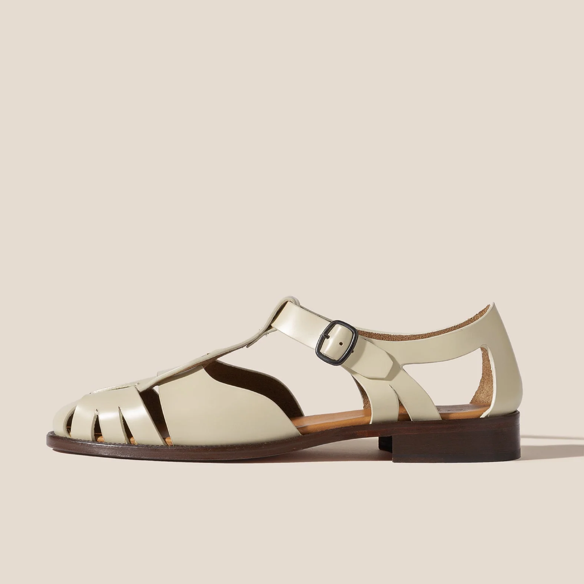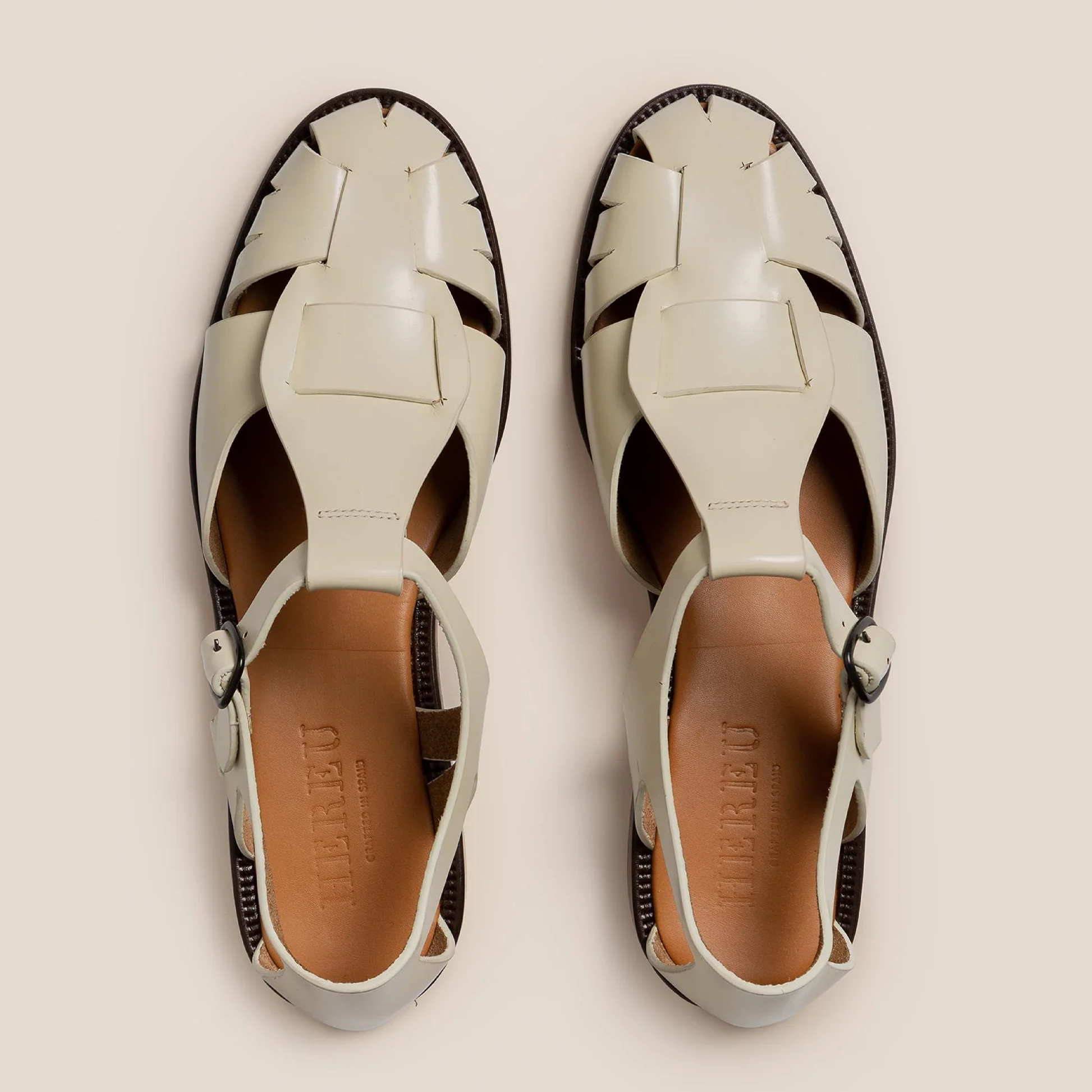 Den klassiske Pesca sandal i farven 'Custard' fra HEREU. Sandalen er håndsyet i spanien med traditionelle mokkasinkonstruktion i spansk kalveskind, og lukkes med et justerbart spænde foran.