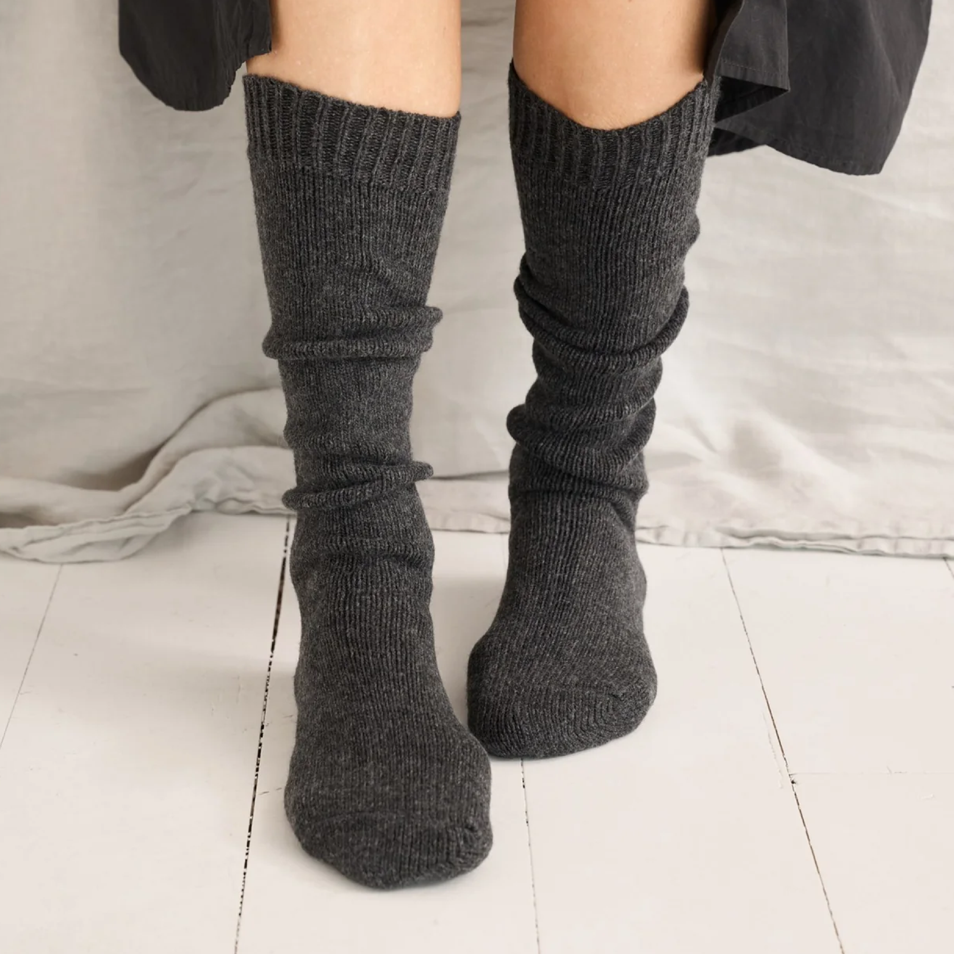 Skønne og varme strikkede strømper fra Moshi Moshi Mind, i en skøn cashmere-kvalitet. Den perfekte strømpe til at holde dine fødder varme i de kolde måneder.