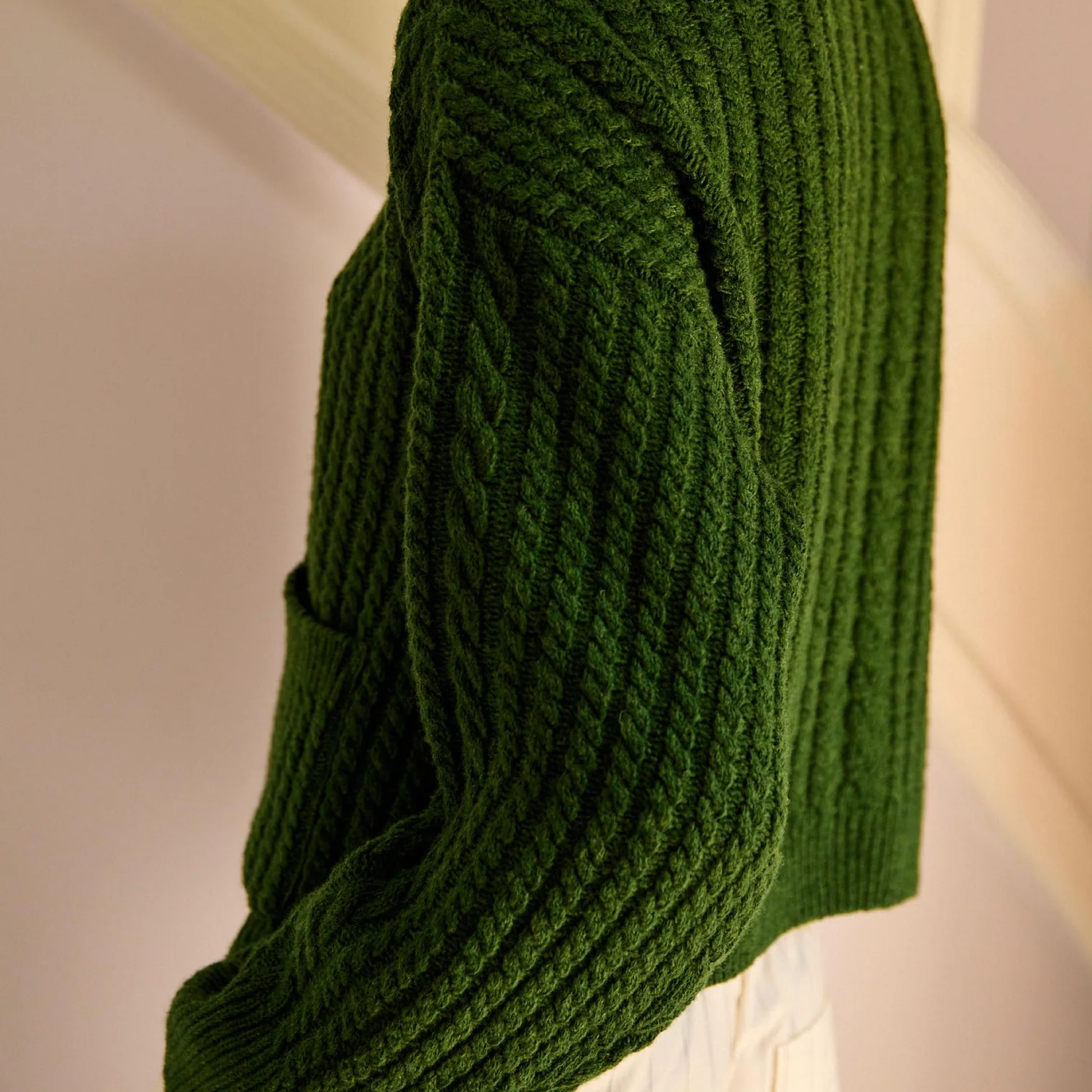 Gertrud Cable Sweater fra det danske brand, Proem Parades. En chunky, blød og iøjnefaldende strik - med et tidløst twist, designet til at holde i årevis. Kabelstrikningen tilføjer rig tekstur og en følelse af stille luksus. Med sin kasseformede, let croppede pasform fungerer den perfekt som en sensommerjakke eller et hyggeligt hverdagslag. Den dybe kaktusgrønne nuance tilføjer et dristigt, smukt touch til ethvert outfit.