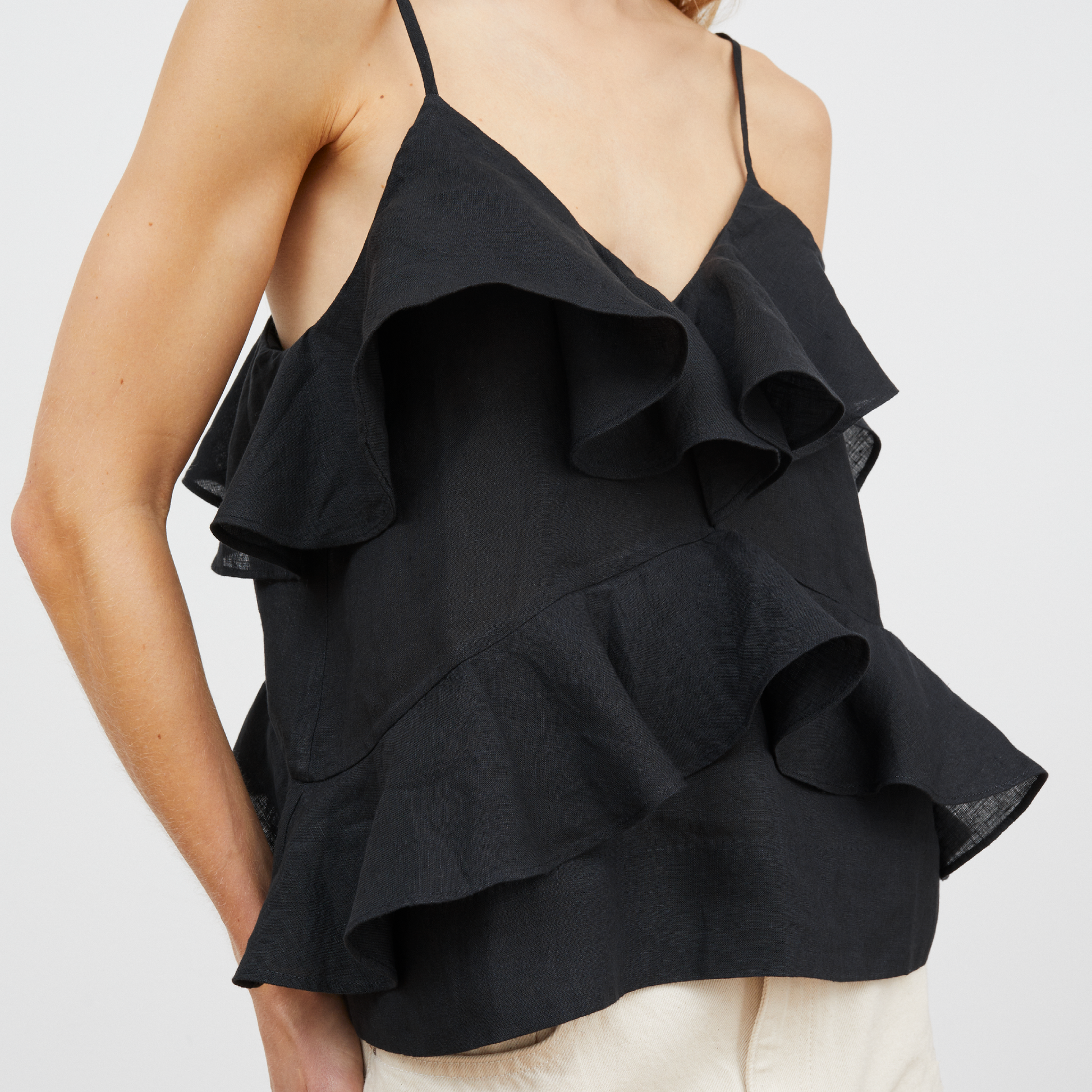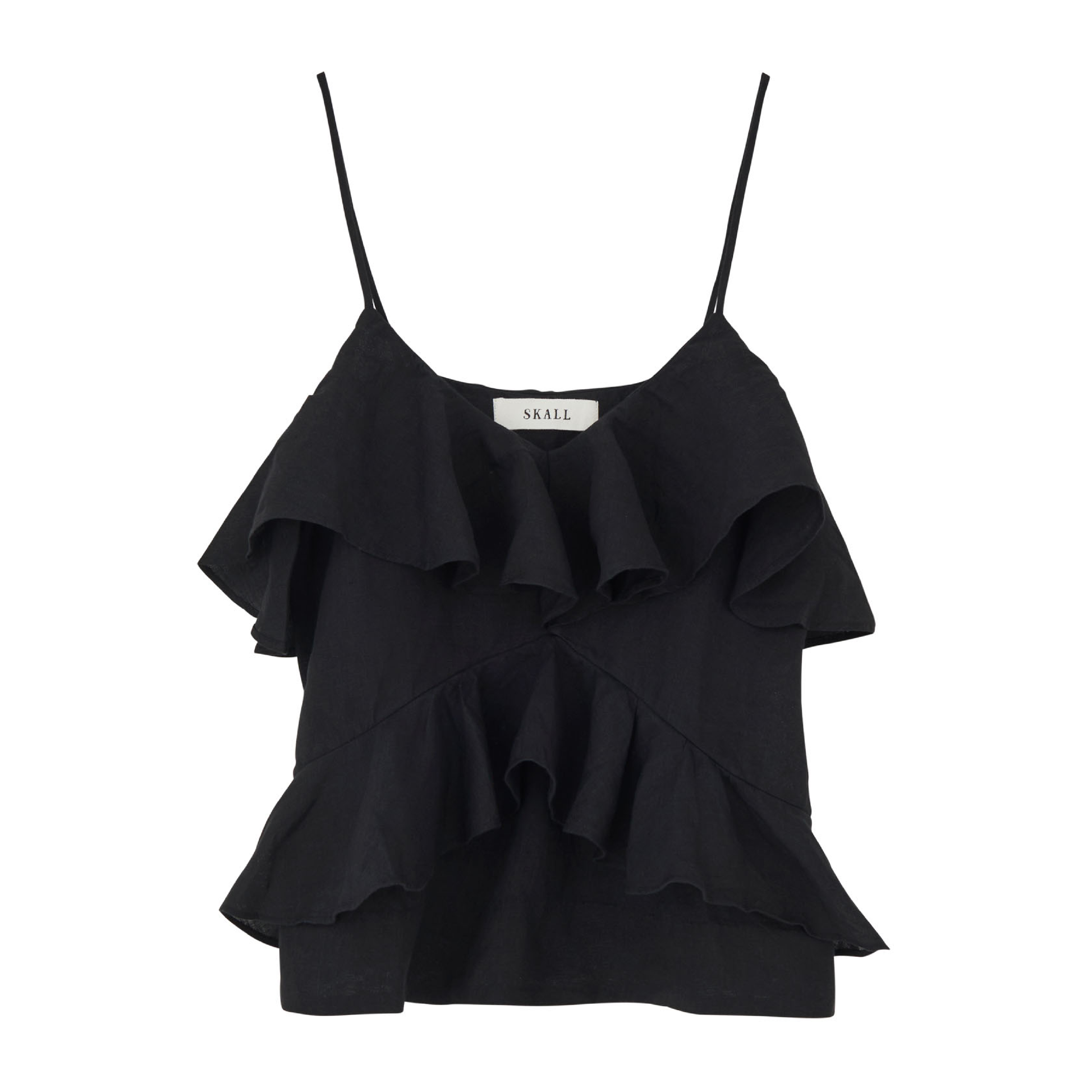 Den fine Benedicte top fra Skall Studio. En luftig top i 100% hør med to fine flæsedetaljer – én over brystet og én om livet. De smalle stropper i samme stof giver et enkelt og elegant look.