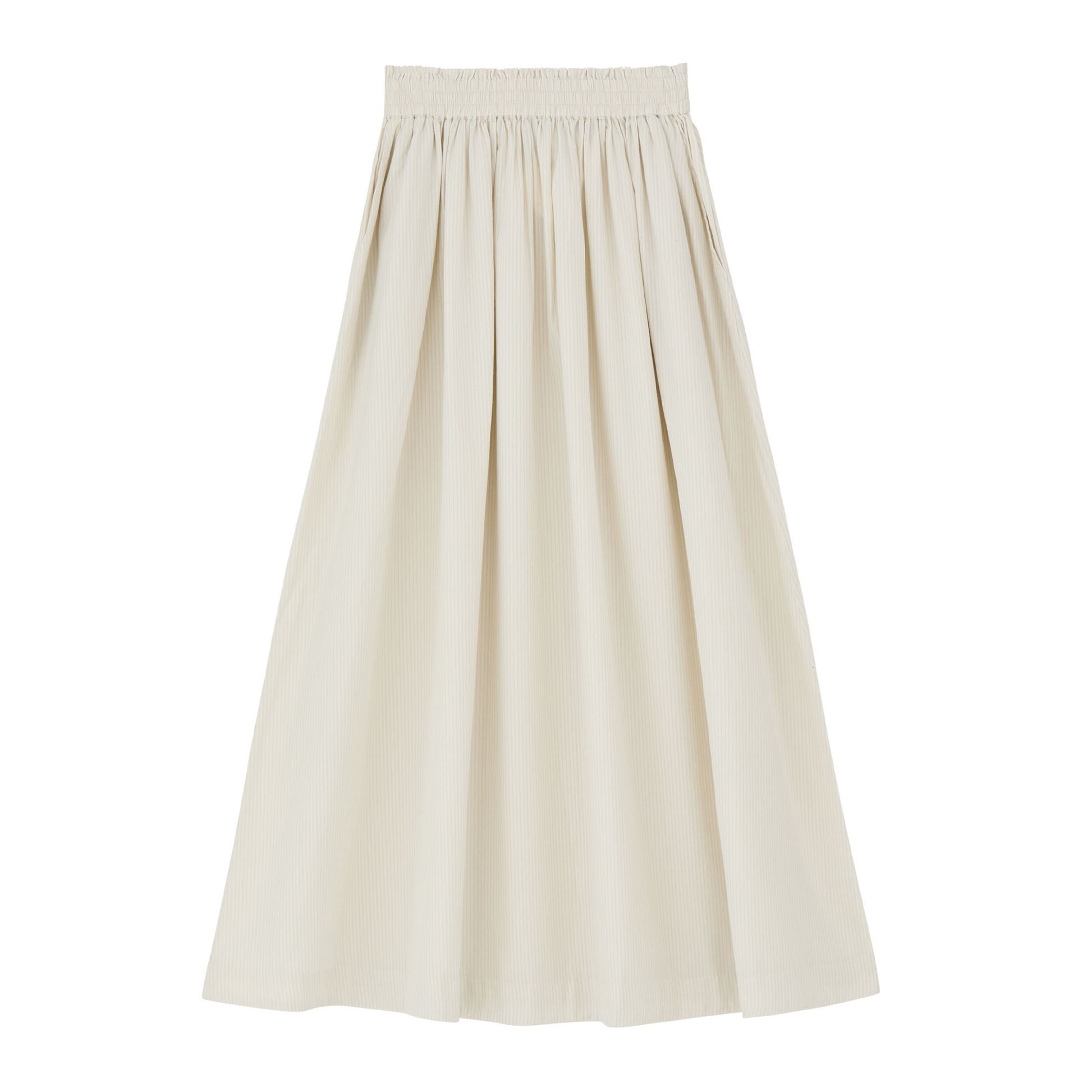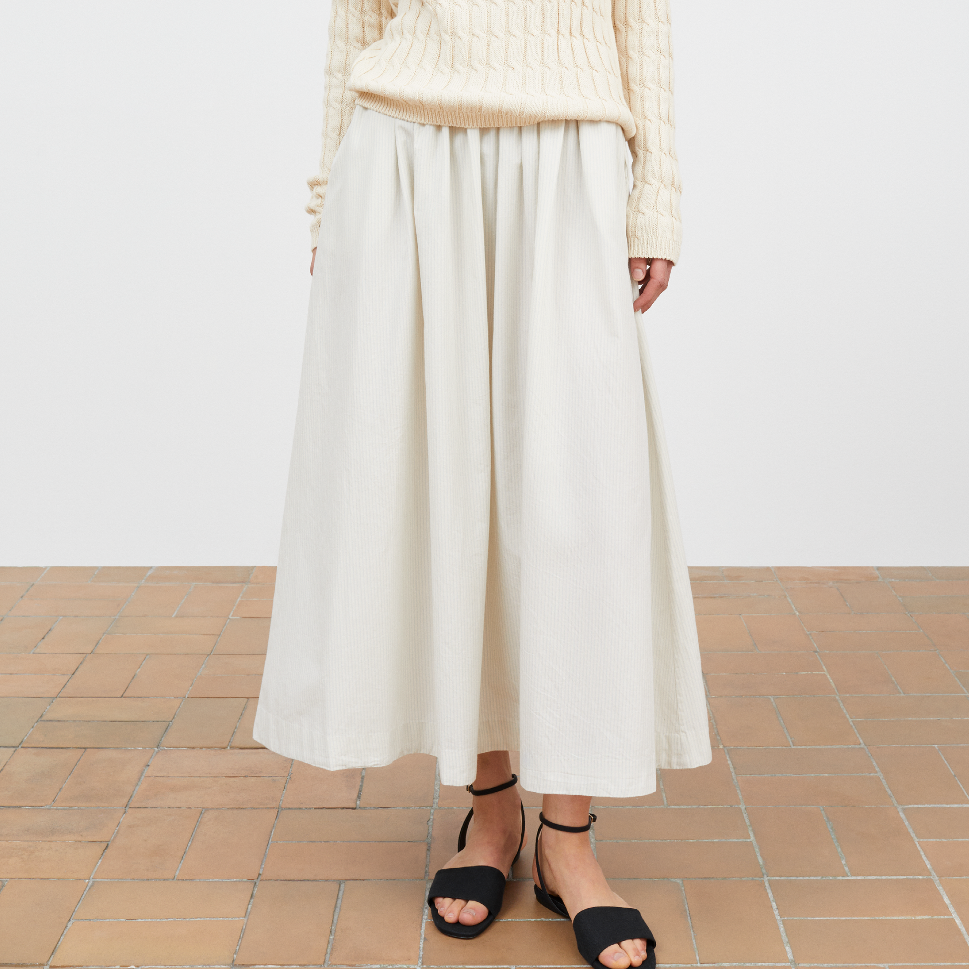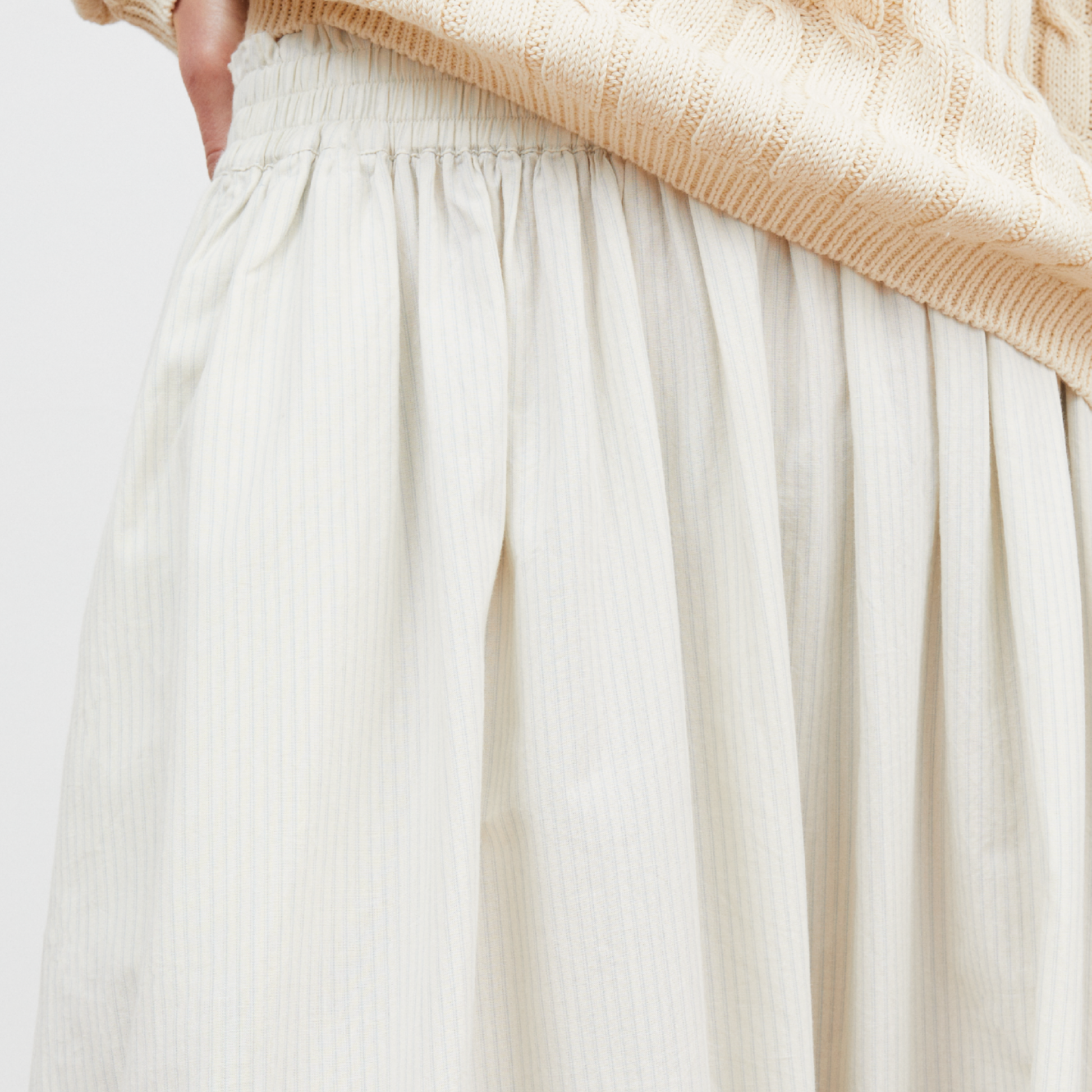 Dagny Skirt fra Skall Studio, i det fineste lyseblå-stribet stof. Nederdelen har elastisk talje, samt masser af vidde og sidelommer.