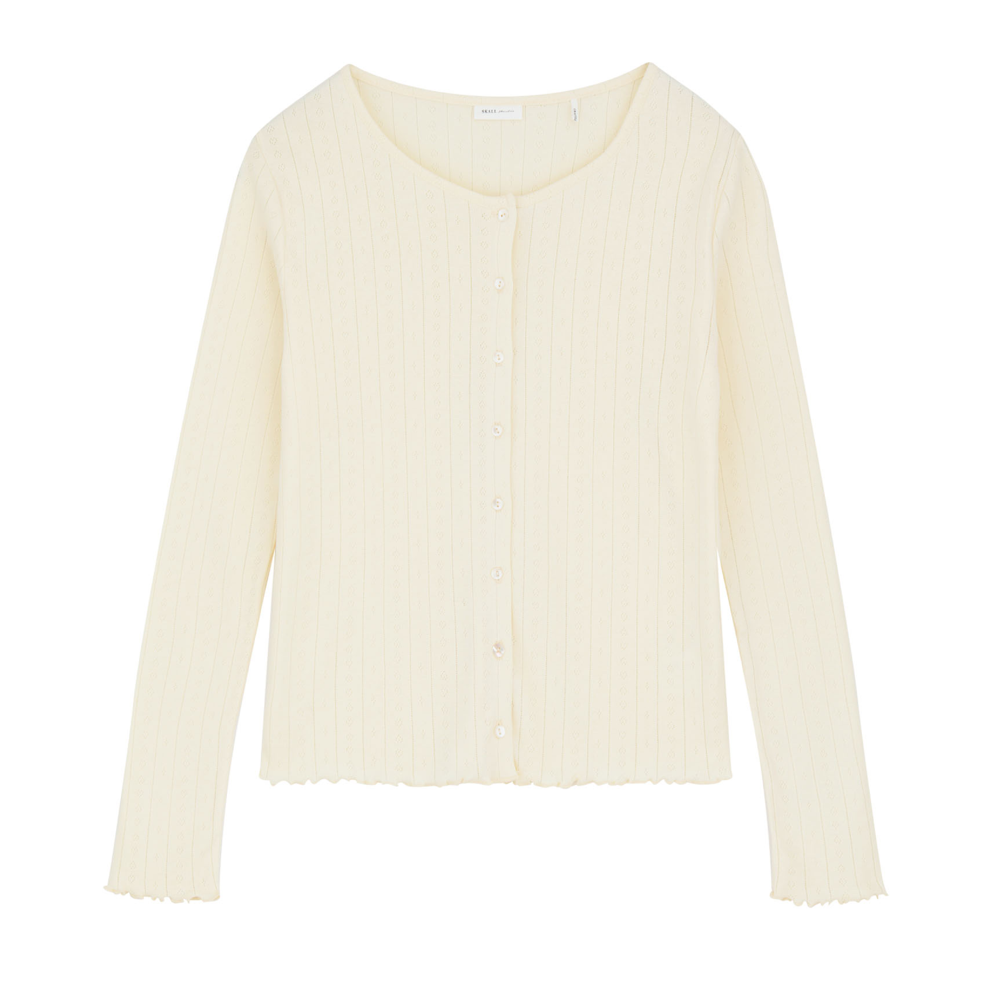 Den klassiske Edie cardigan fra Skall Studio, i smuk creme farve. Cardiganen er fremstillet i 100% økologisk bomuld, med det fineste hulmønster - og er én af vores personlige favoritter.