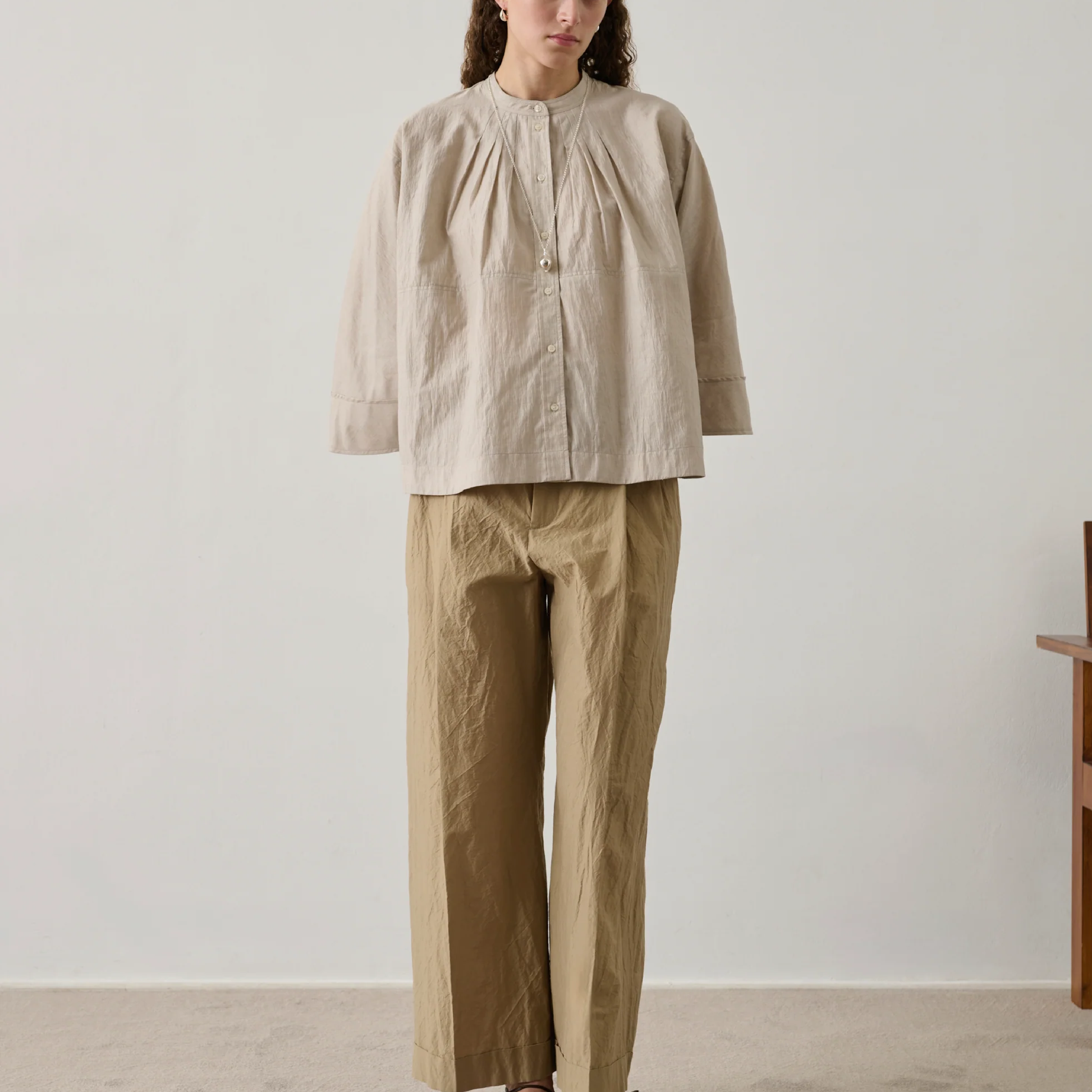Smuk skjortebluse fra det franske brand, Soeur. Skjorten har en rund halsudskæring, med brede ærmer og et bredt snit. Den har knaplukning og syet folder foran.