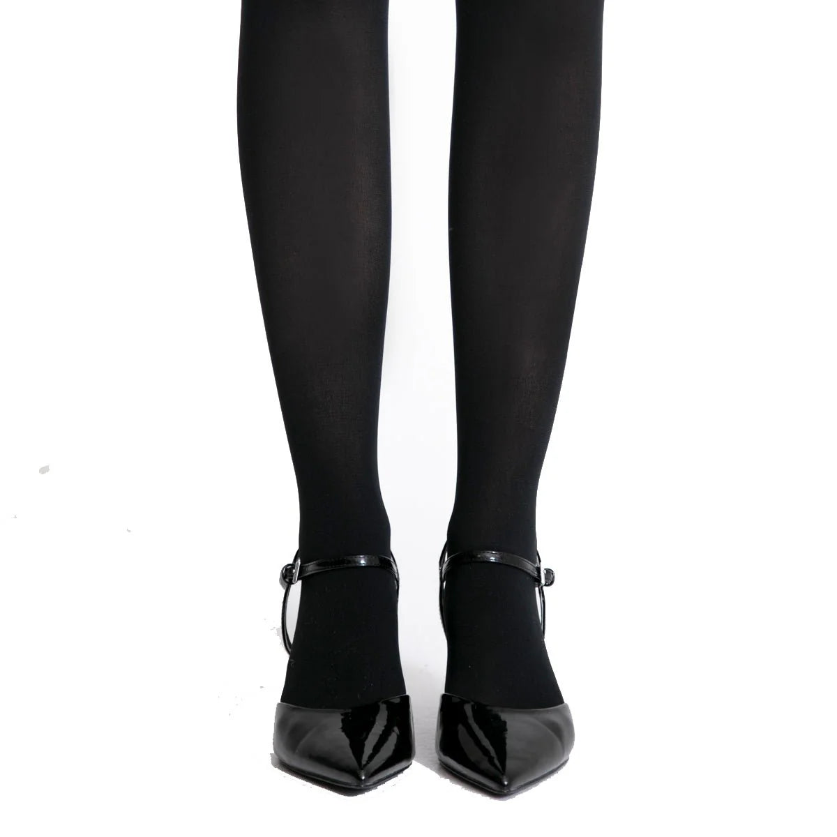 Klassiske sorte strømpebukser fra svenske Mrs. Hosiery. Strømpebukserne har et mat udseende og fløjlsagtig følelse med suveræn pasform, flade sømme og lang holdbarhed. Strømpebukserne har høj elasticitet for god pasform og en stabil talje.